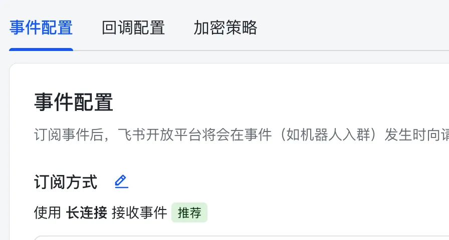 在“事件配置”页签中选择 “长连接接收事件”,点击保存。