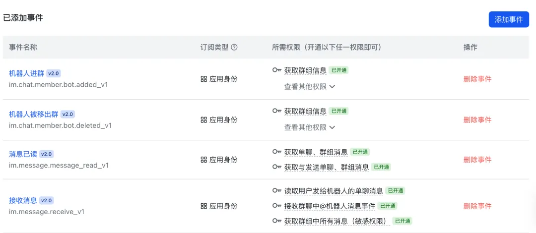 如果想要将飞书机器人添加进聊天群组中使用,可以参考前述步骤继续添加更多群组相关权限,主要包括“消息已读”、“机器人进群”、“机器人被移出群”。如果不需要的话,可以忽略。