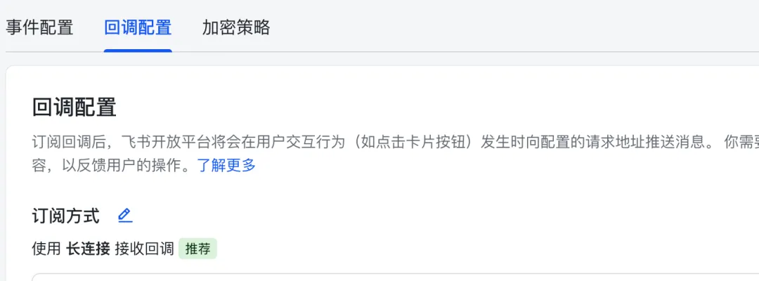在“事件与回调-回调配置”页面中,订阅方式选择 “使用长连接接收回调”,点击保存,配置自动生效。