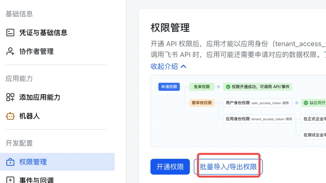 在飞书应用管理页,左侧导航栏找到 “权限管理” ,点击进入页面。