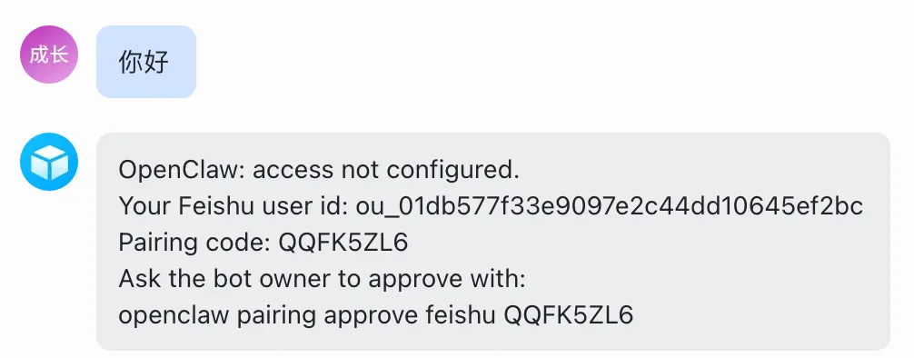 首次对话会如果提示如下图所示的配对请求,可以复制机器人回复的最后一行命令行。