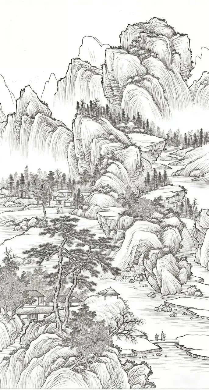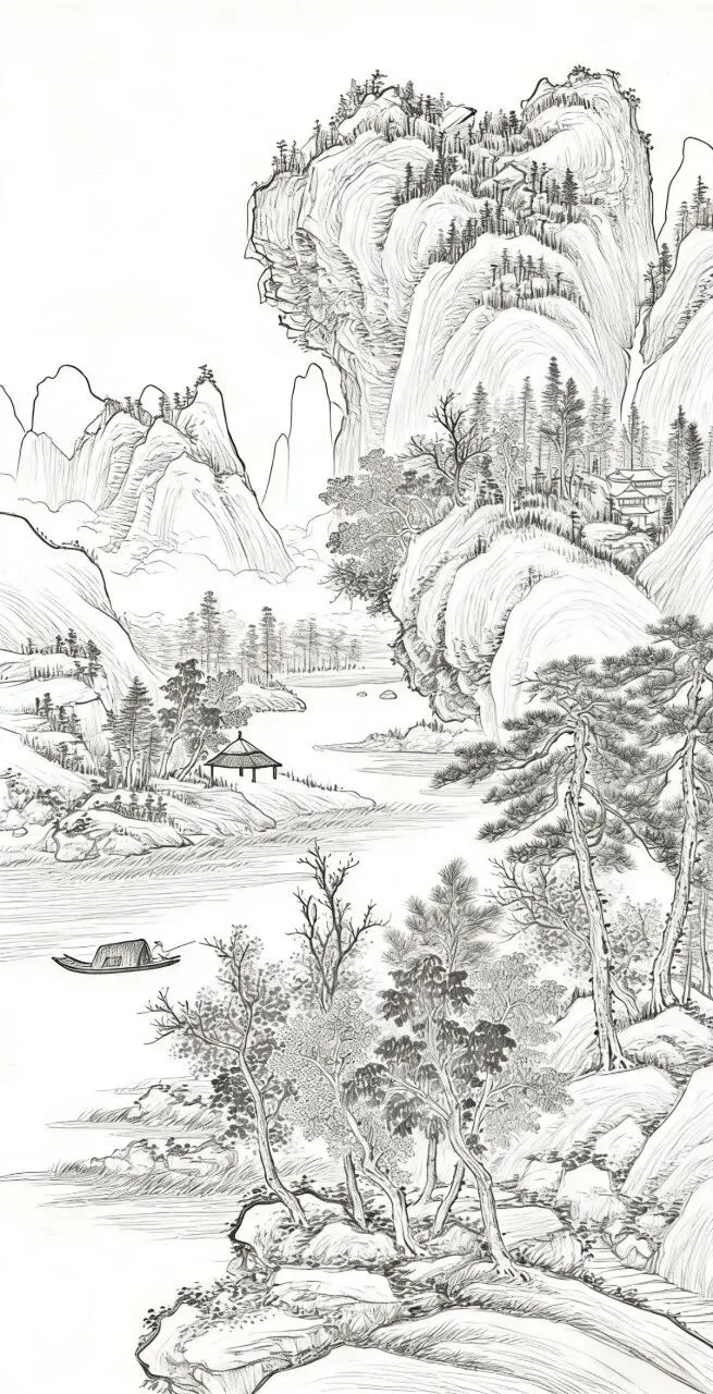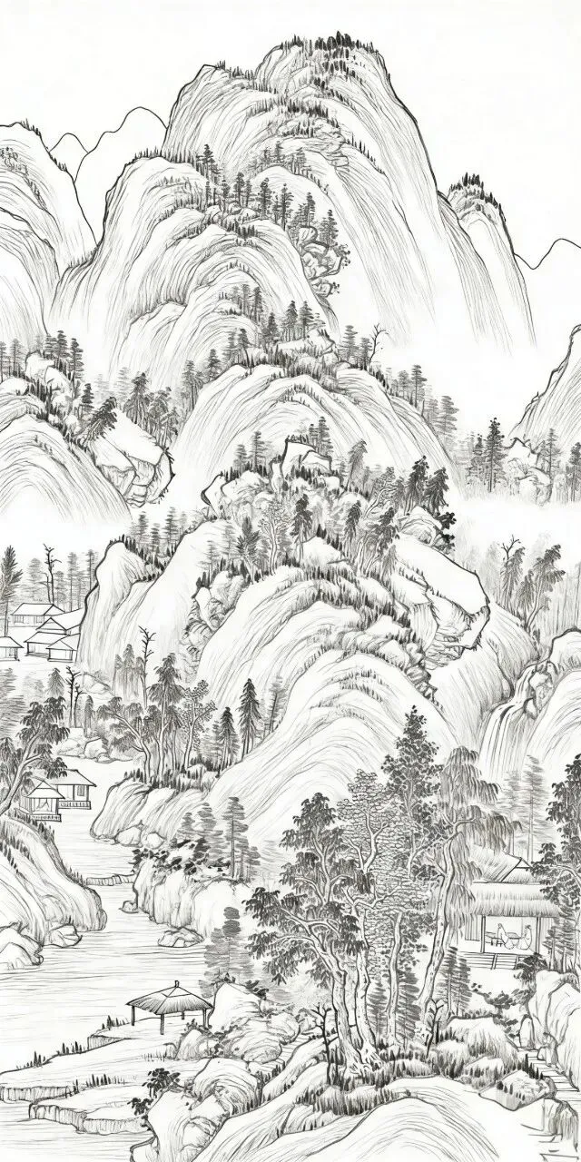 对于零基础想学国画的朋友来说,高清山水画白描线稿是非常实用的起步素材。不用纠结墨色浓淡与渲染技巧,先专注练习线条的流畅度、轻重变化和整体布局。
