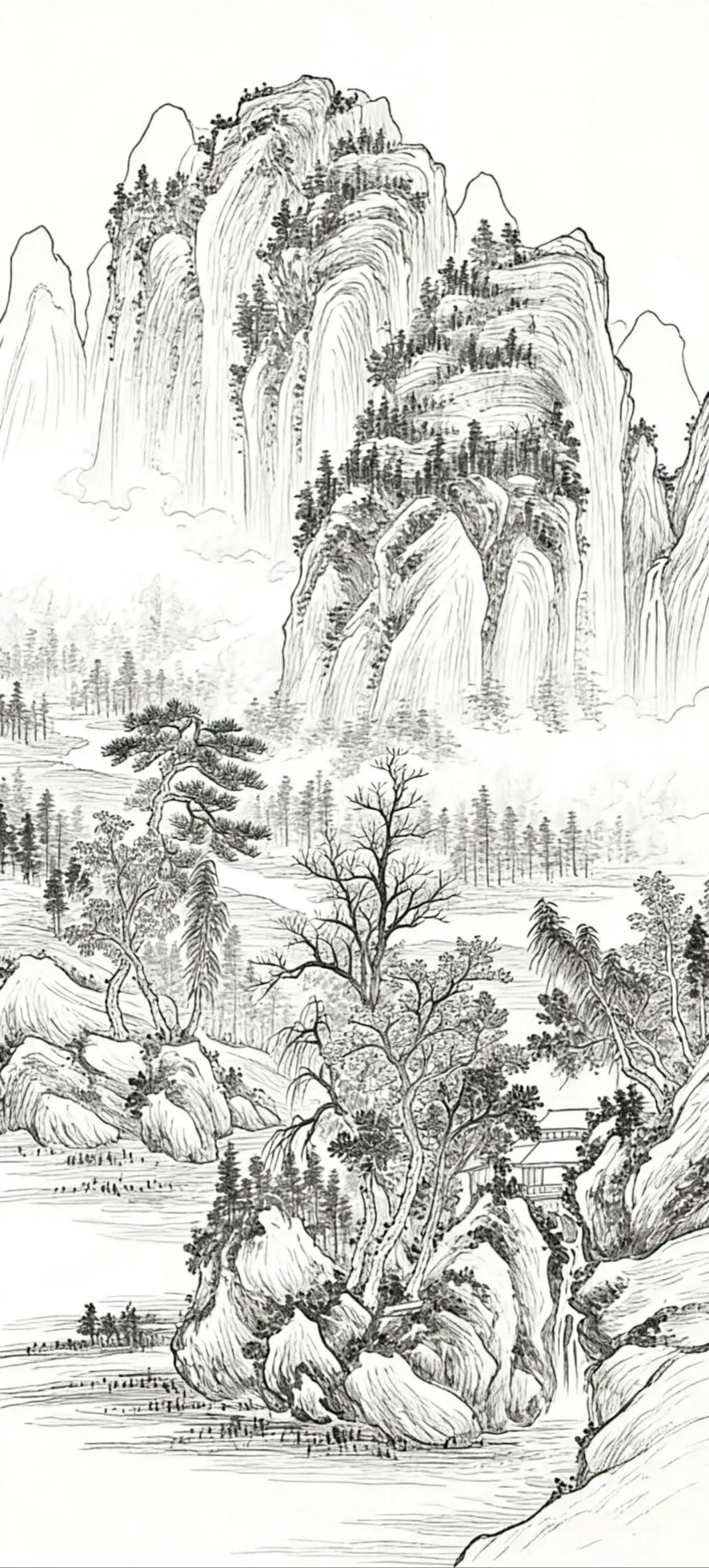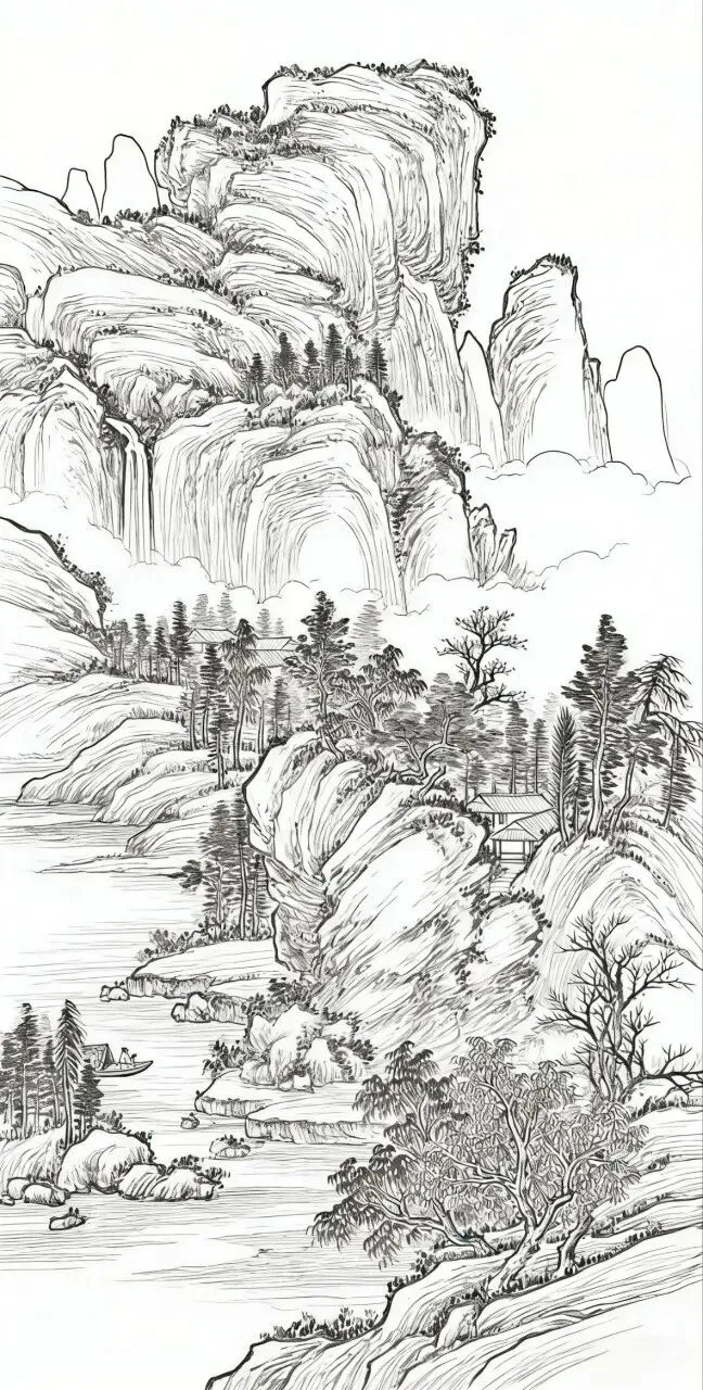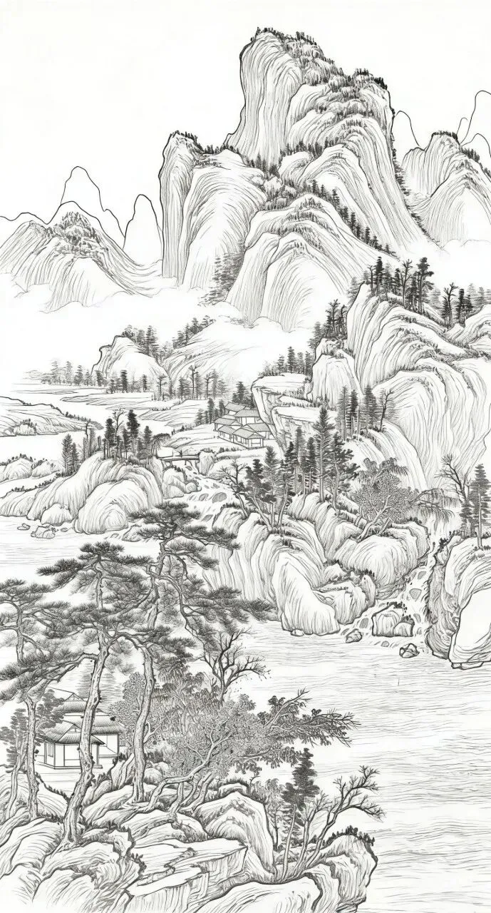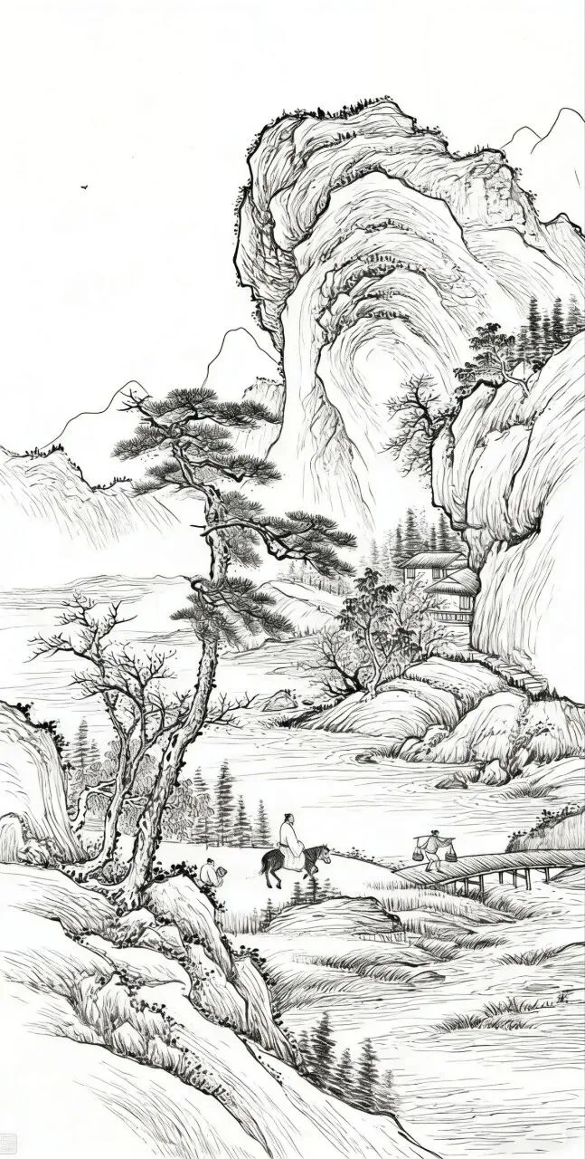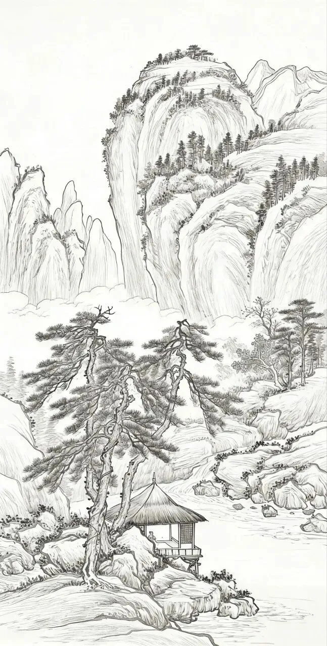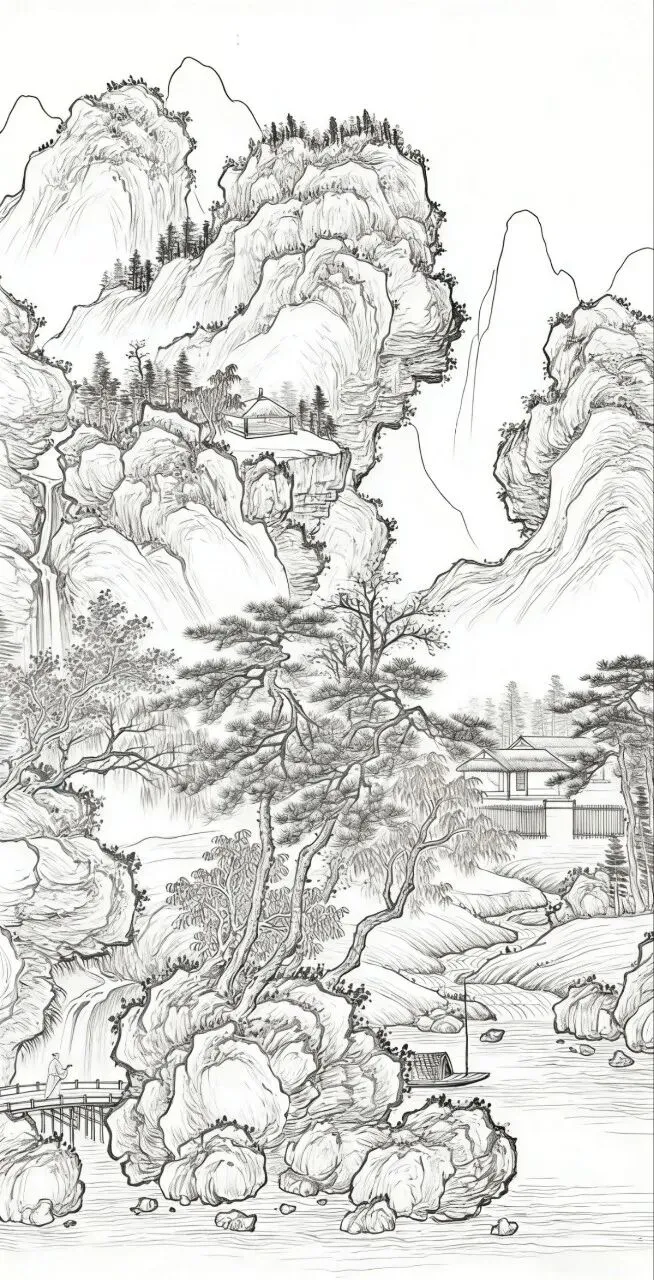 在中国传统国画里,白描山水是最显笔墨风骨、也最易入门的绘画形式。褪去繁复色彩,单靠线条勾勒山石、林木、云烟与流水,就能把中式山水的空灵悠远表现得恰到好处。