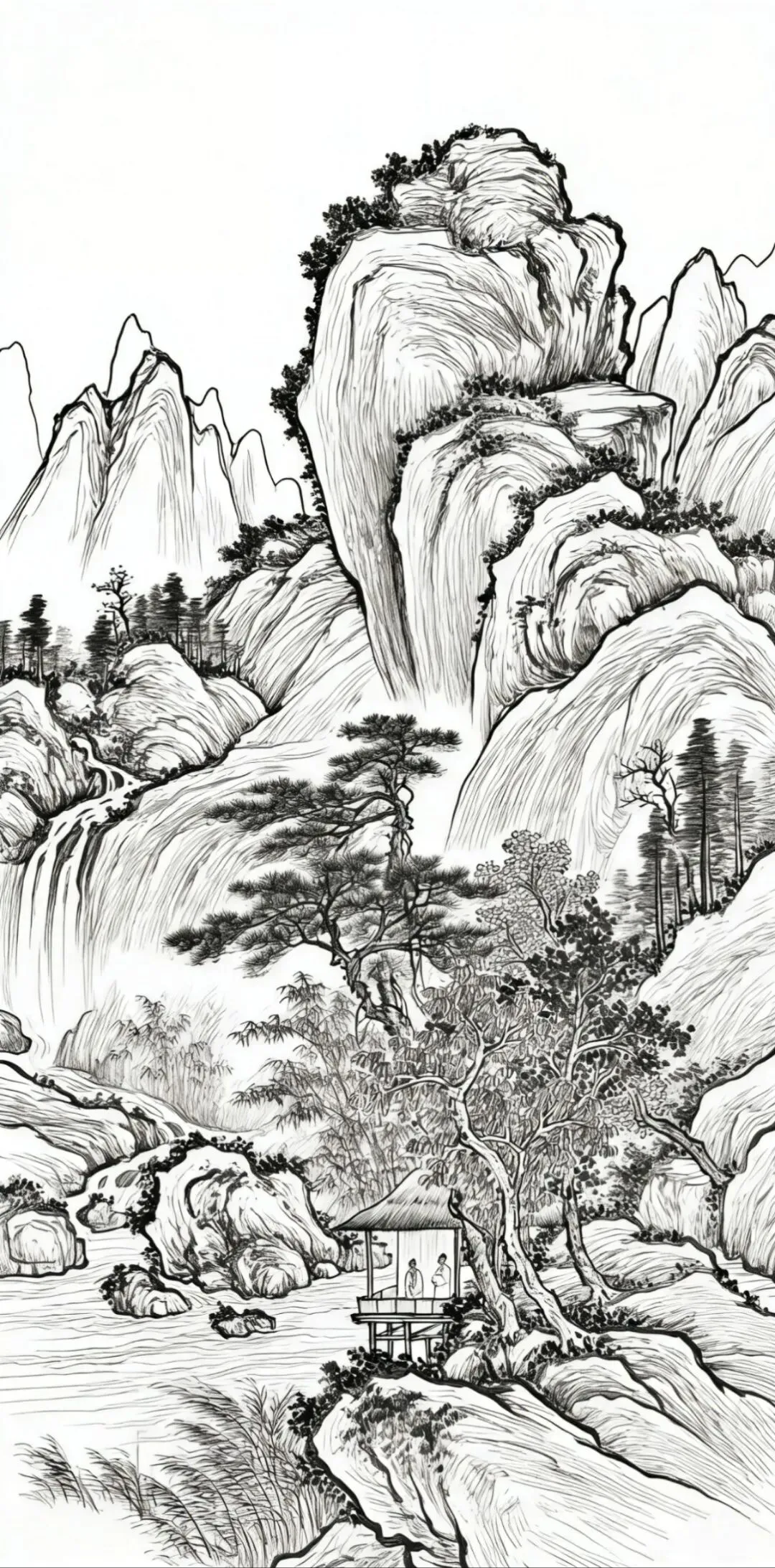 一步步掌握山石结构、树木姿态和画面开合关系。这些线稿细节清晰、比例协调,打印出来就能直接临摹,方便日常练习与反复修改。