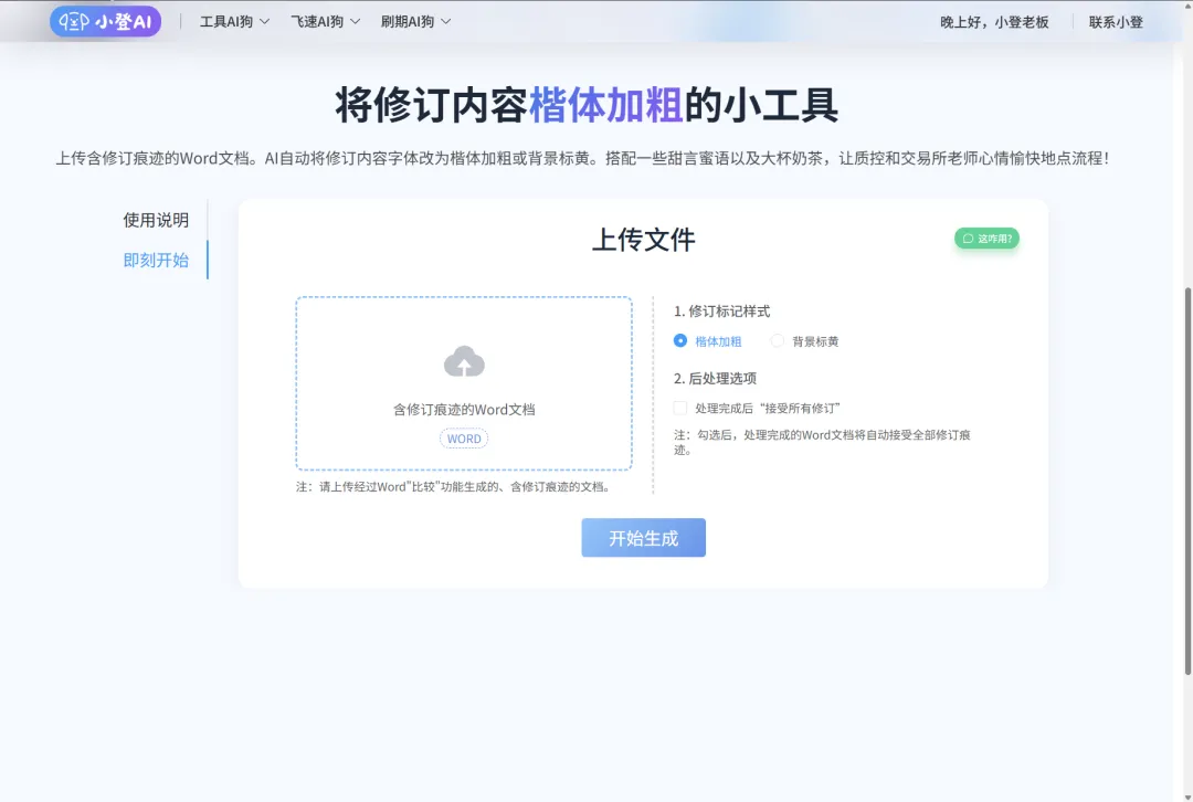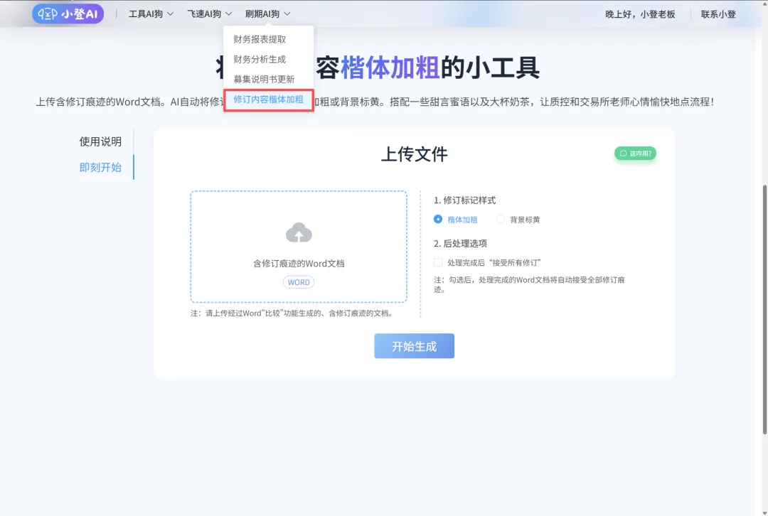 如下图,在“刷期AI狗”下拉菜单中找到“修订内容楷体加粗”模块,上传带有修订痕迹的的Word募集说明书,点击“开始生成”。