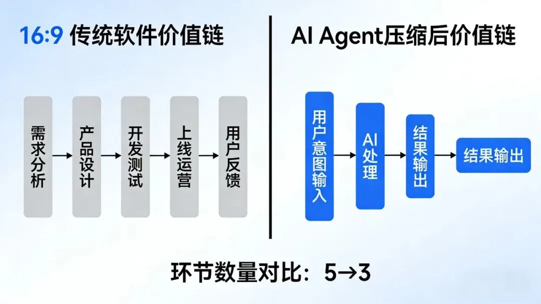 AI Agent 直接将多环节链路压缩为「用户意图→Agent自动执行→业务结果」两步,这不是效率提升,而是价值链的根本性重构。若仅用AI赋能团队提升交付效率,本质是加速奔向正在消失的市场——因为「交付」本身正变得极度廉价。