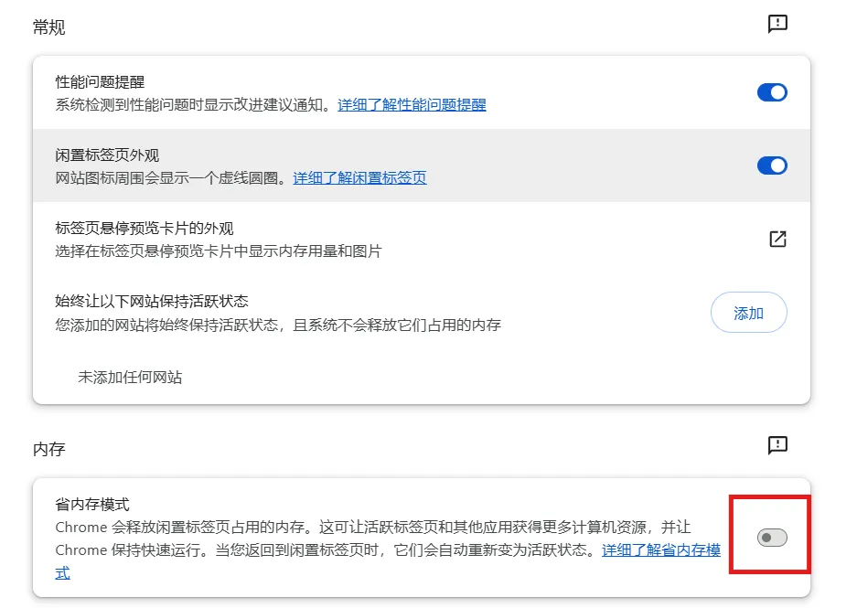操作路径是:Chrome 右上角“︙” → 设置 → 性能(Performance)→ 关闭 Memory Saver(省内存模式)。