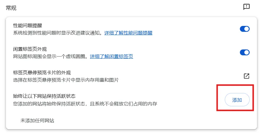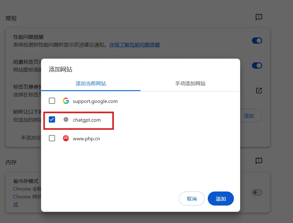 也是在 Chrome操作:设置 → 性能(Performance)→ Always keep these sites active(始终保持这些网站处于活动状态)→ Add,把 ChatGPT 加进去。