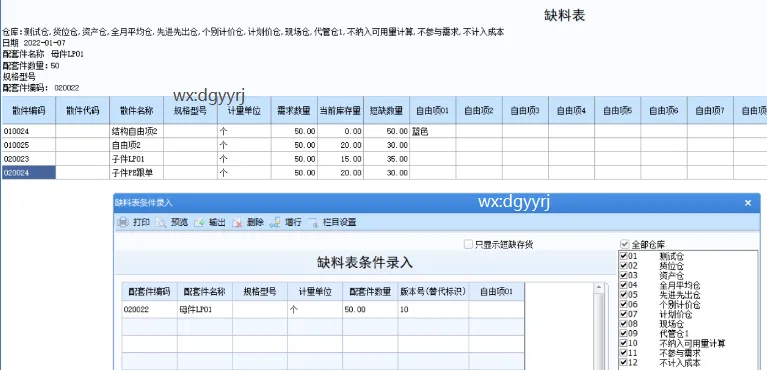 1、如图下缺料表有很多字段,先对这些字段进行简要的说明。版本号/替代标识:根据选择配套件编码选择对应的的物料清单(包括主BOM、替代BOM和委外商BOM),不支持客户BOM和订单BOM;不录入则系统根据当前日期取默认BOM展开;条件中自由项:针对启用了自由项且为是否结构性为是的配套件存货;仓库:可选择仓库包含仓库档案中所有仓库,不管是否停用;散件:根据配套件的物料清单带入;需求数量:根据配套件数量及其物料清单计算出散件需求量;当前库存量:根据散件可用量带出,当散件为LP件,取自由库存。