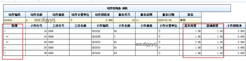 2、库存缺料表应用实例说明,如下图结构搭建的BOM表: