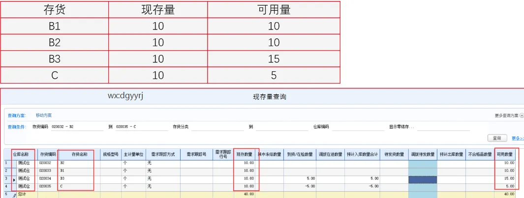 各存货的现存量及可用量如下: