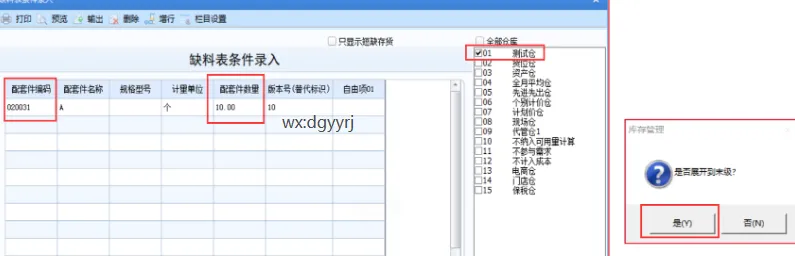 4、缺料表选择配套件A,数量为10,勾选有现存量和可用量的仓库,不勾选只显示短缺存货,是否展开到末级为是,进行查询