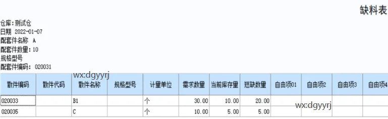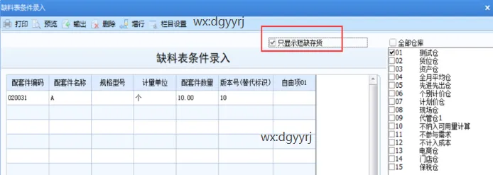 5、其他条件不变,勾选只显示短缺存货时,查询显示短缺的物料