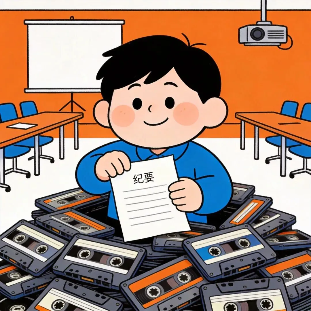 配图建议:卡通人物从堆积如山的录音带中轻松抽出一张简洁的纪要纸,表情从焦虑变为微笑。