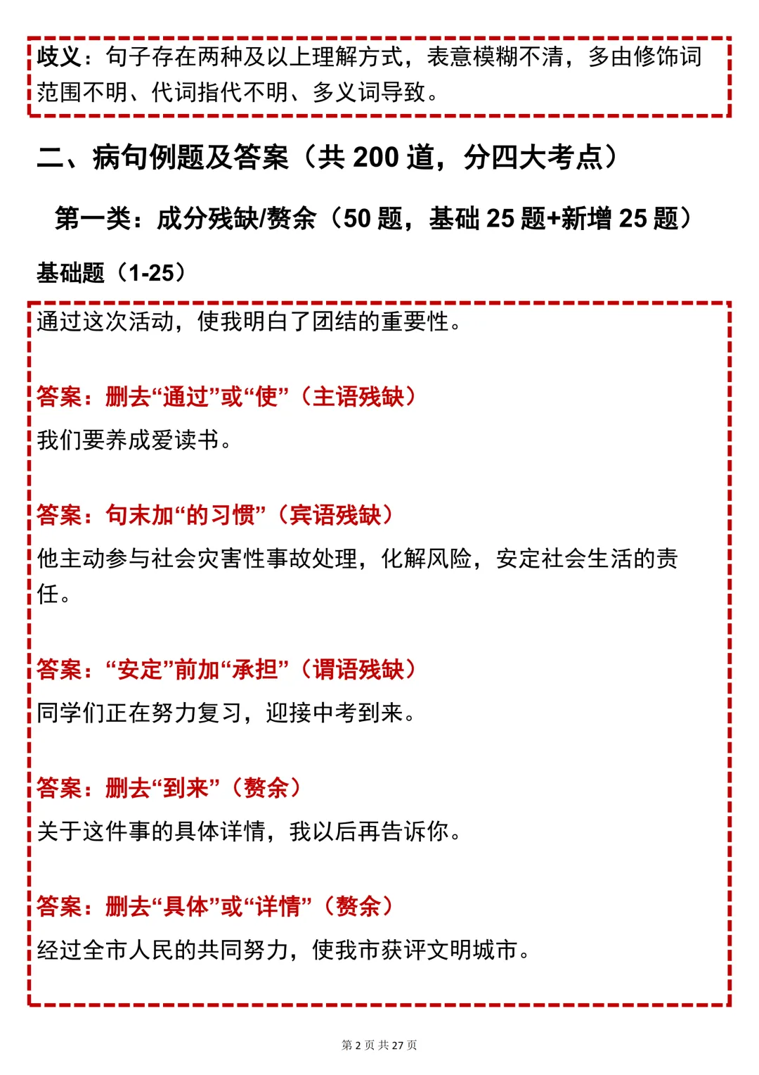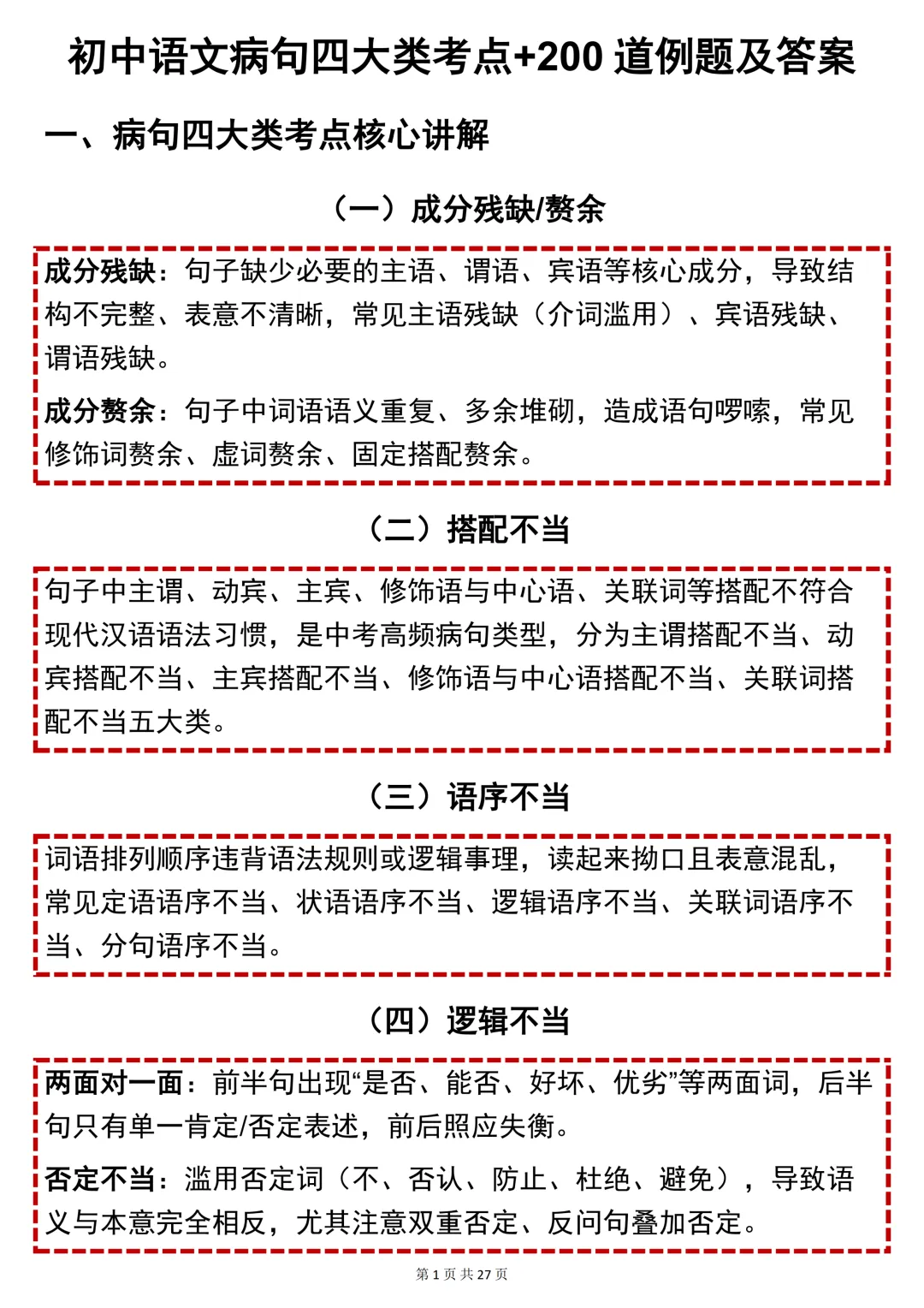 今天给大家整理了中考都用得上的【初中语文病句四大考点 + 200 道例题及答案】,不管题型如何变式,都能从容应对,轻松斩获满分!
