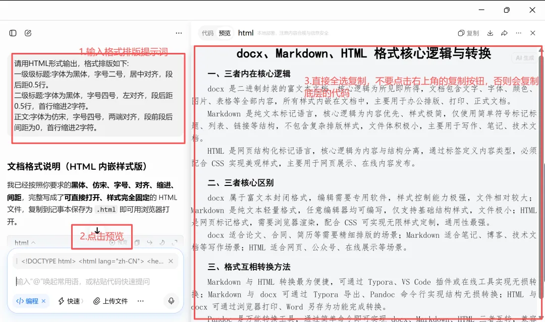 Word对HTML的样式还原度较高,也可以说Word对HTML的兼容度比较高。也有更加方便的方式,那就是在写提示词的时候,再加上一段输出内容格式排版的话: