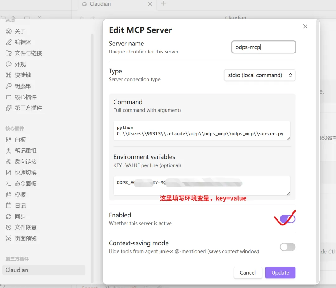 obsidian的claudian插件中,mcp需要在插件设置页面单独配置,配置样例如下图: