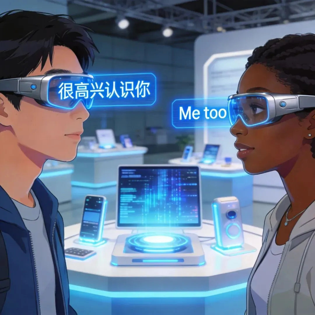 “这款AI翻译眼镜融合增强现实与语言大模型技术,支持实时语音识别与多语种字幕翻译,对话内容以清晰字幕实时呈现在用户视野中,实现’所见即所译’。”