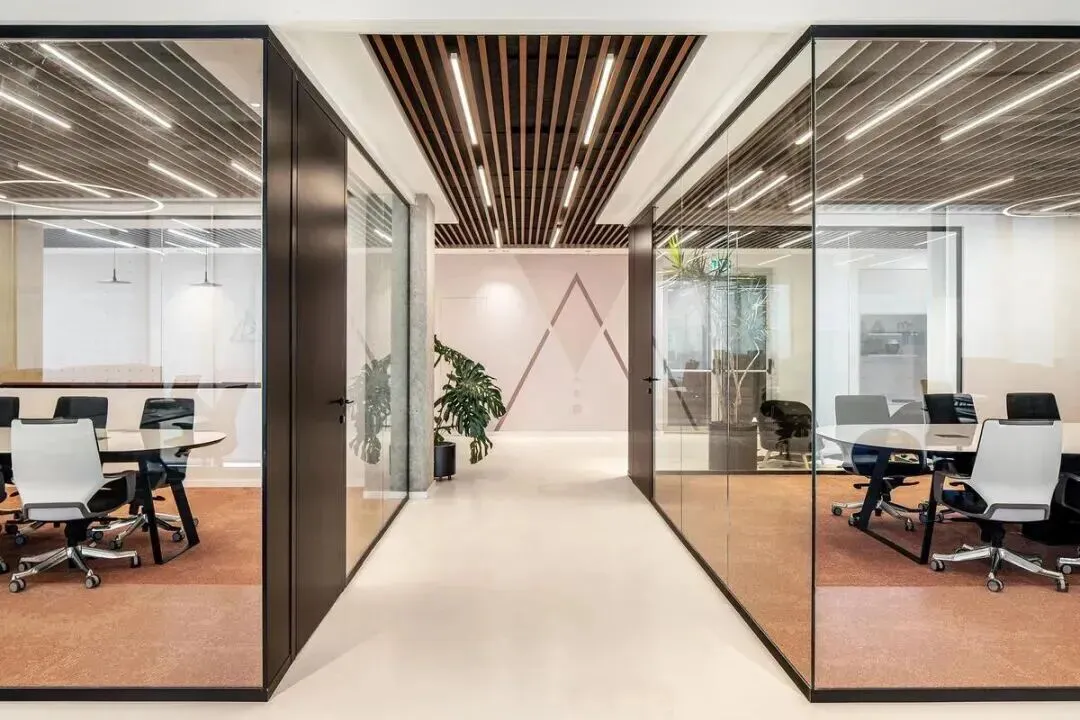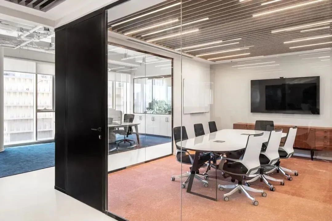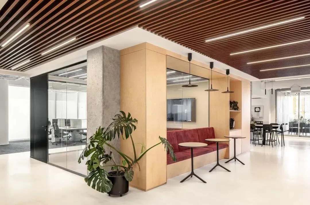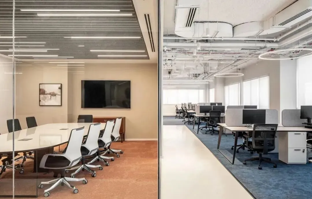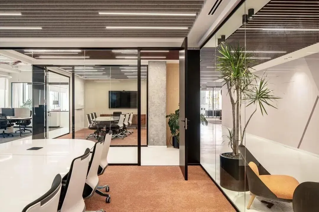 本案办公环境设计的核心原则是简洁与功能并重。通过使用简洁线条和清晰简约的空间氛围,减少过多图形元素和色彩的干扰。空间规划最大限度利用开敞外窗,引入充足自然光和开阔景观视野,营造明亮舒适的工作环境。