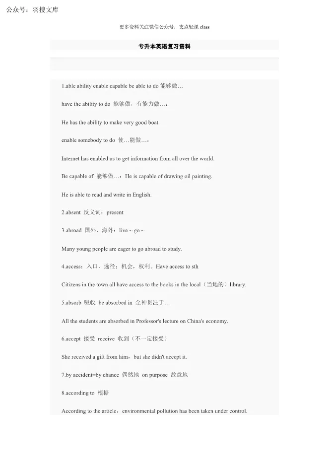 【PDF】专升本英语高频词、短语复习总结 电子版试卷获取,后台回复:试卷