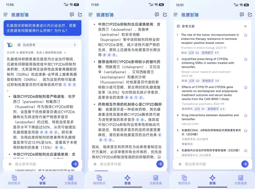 医渡智循实测表现:他莫昔芬是乳腺癌内分泌治疗的常用药物,医渡智循判断出CYP2D6抑制剂类药物对他莫昔芬代谢的影响,基于此进行了详细的分析,在回答中明确指出需严格避免强效抑制剂(帕罗西汀、氟西汀),谨慎使用中效抑制剂(度洛西汀、舍曲林等),并推荐低影响替代药物(西酞普兰、文拉法辛等),同时深入解释了酶抑制机制及临床复发风险数据(引用两年复发率对比)。最终给出6篇高质量参考文献,包括2023-2024年国家癌症中心指南、专家共识及JCR Q1/Q2期刊。