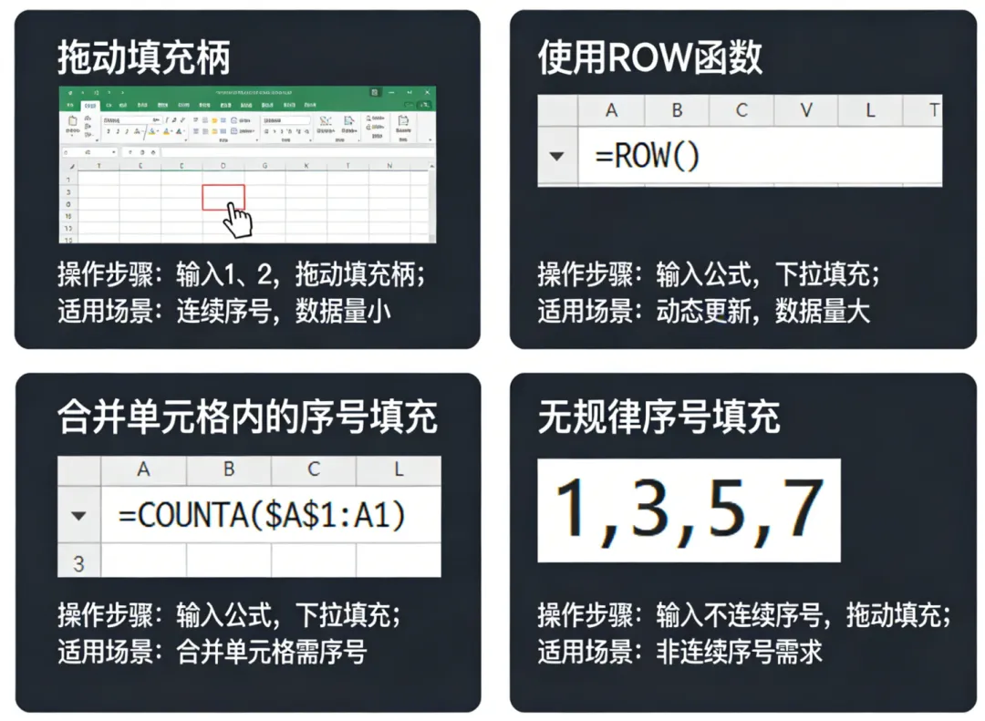 ROW函数适合需要动态更新、避免手动维护的场景。