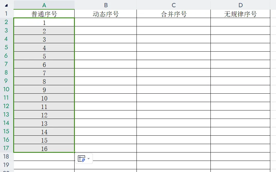 按住鼠标左键向下拖动至目标区域,Excel会自动填充连续序号(1, 2, 3…),如图2所示。