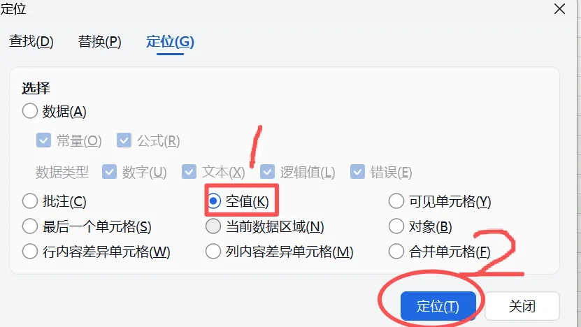 2、按住F5,调出定位窗口,选择其中的空值,如图7所示,点击定位。