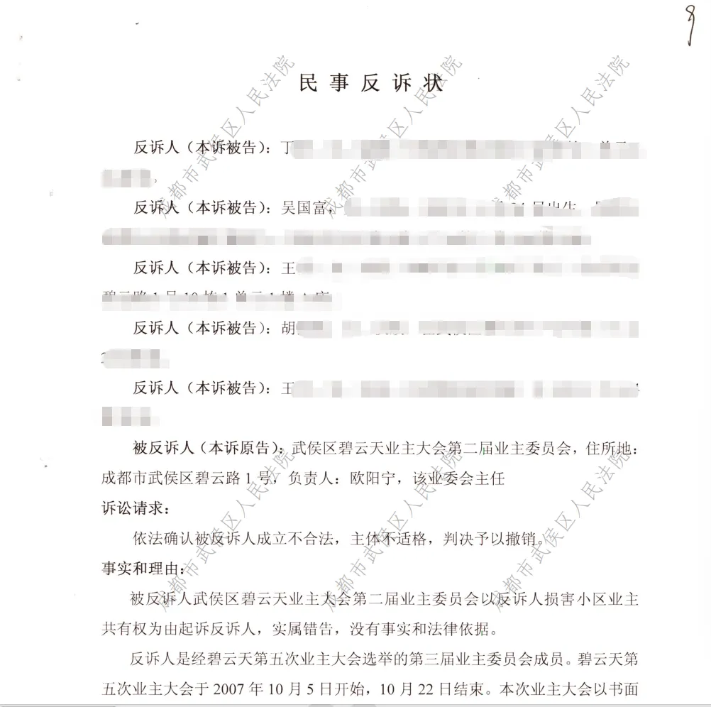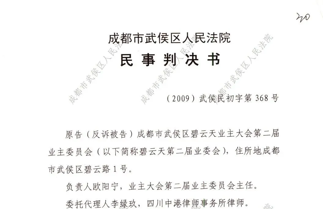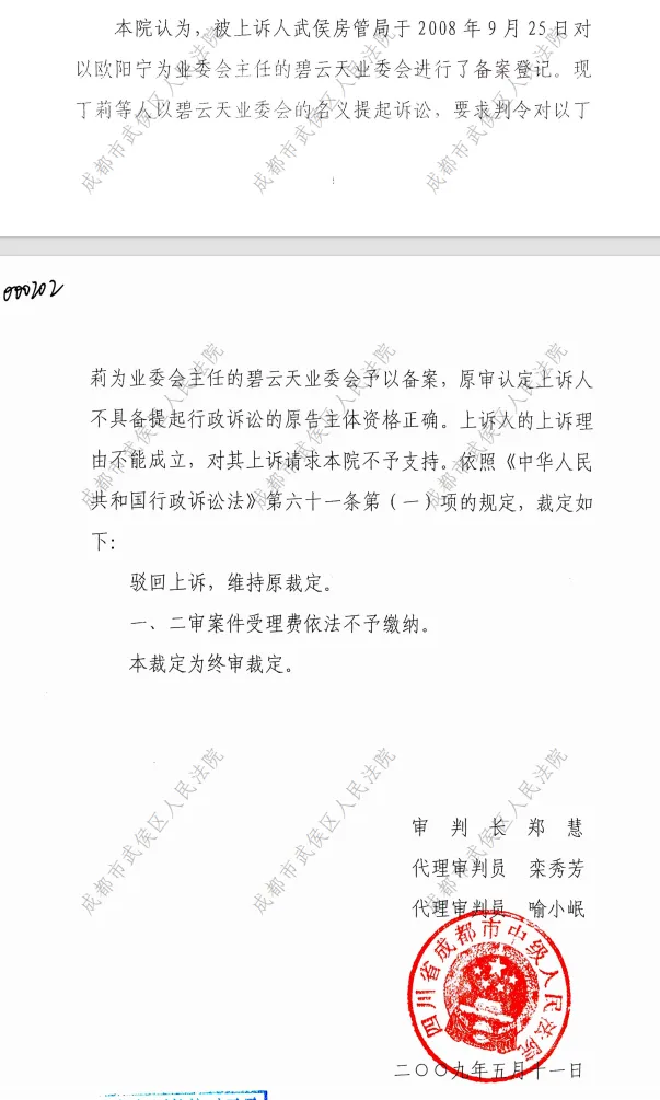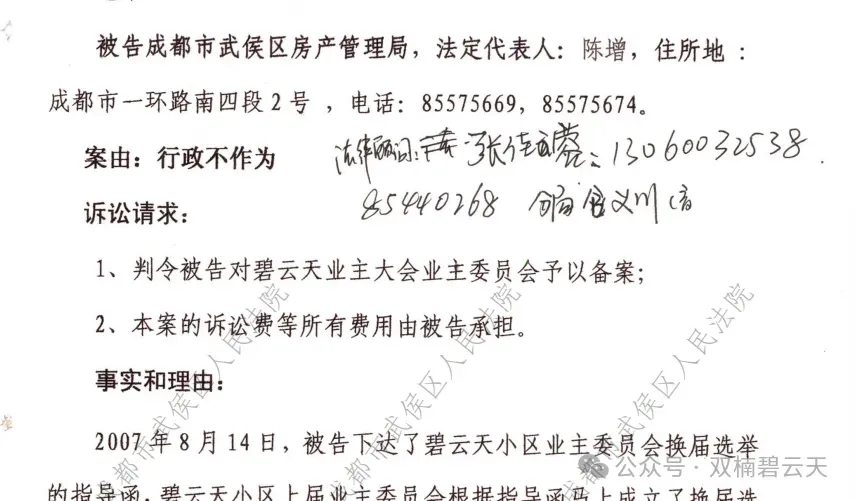 1、2008年8月,碧云天自发自治业委会(时称:第二届业委会,注:未被核准备案)行政起诉武侯区房管局,要求对碧云天业主大会业主业委会予以备案