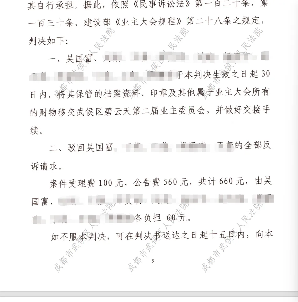 3、2010年3月,武侯区人民法院作出(2009)武侯民初字第368号判决,判决第一届业委会11名成员30日内移交保管的有关凭证、档案、印章、财务资金