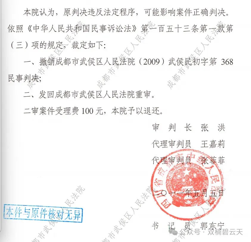 4、2011年5月,此案被成都市中院撤销判决,发回重审