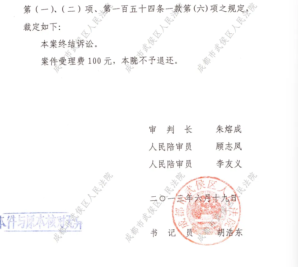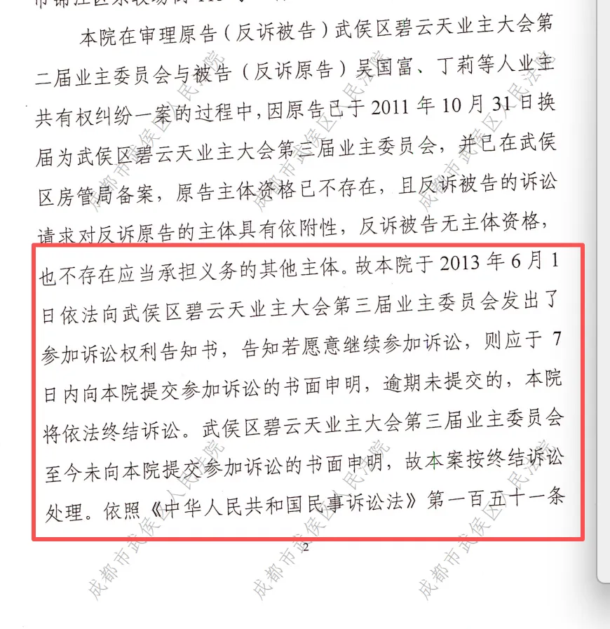 5、2013年6月,因备案的第三届业委会未参与该案后续诉讼,后,武侯区人民法院裁定终结诉讼。