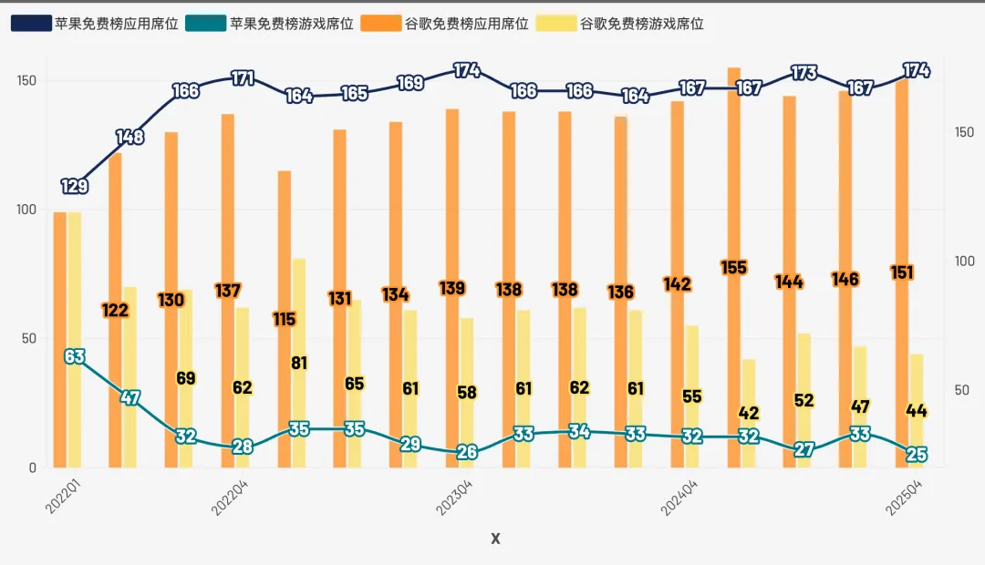 数据来源是两个平台的Top 200排行榜(免费+畅销),按季度统计,涵盖2022Q1到2025Q4共16个季度。