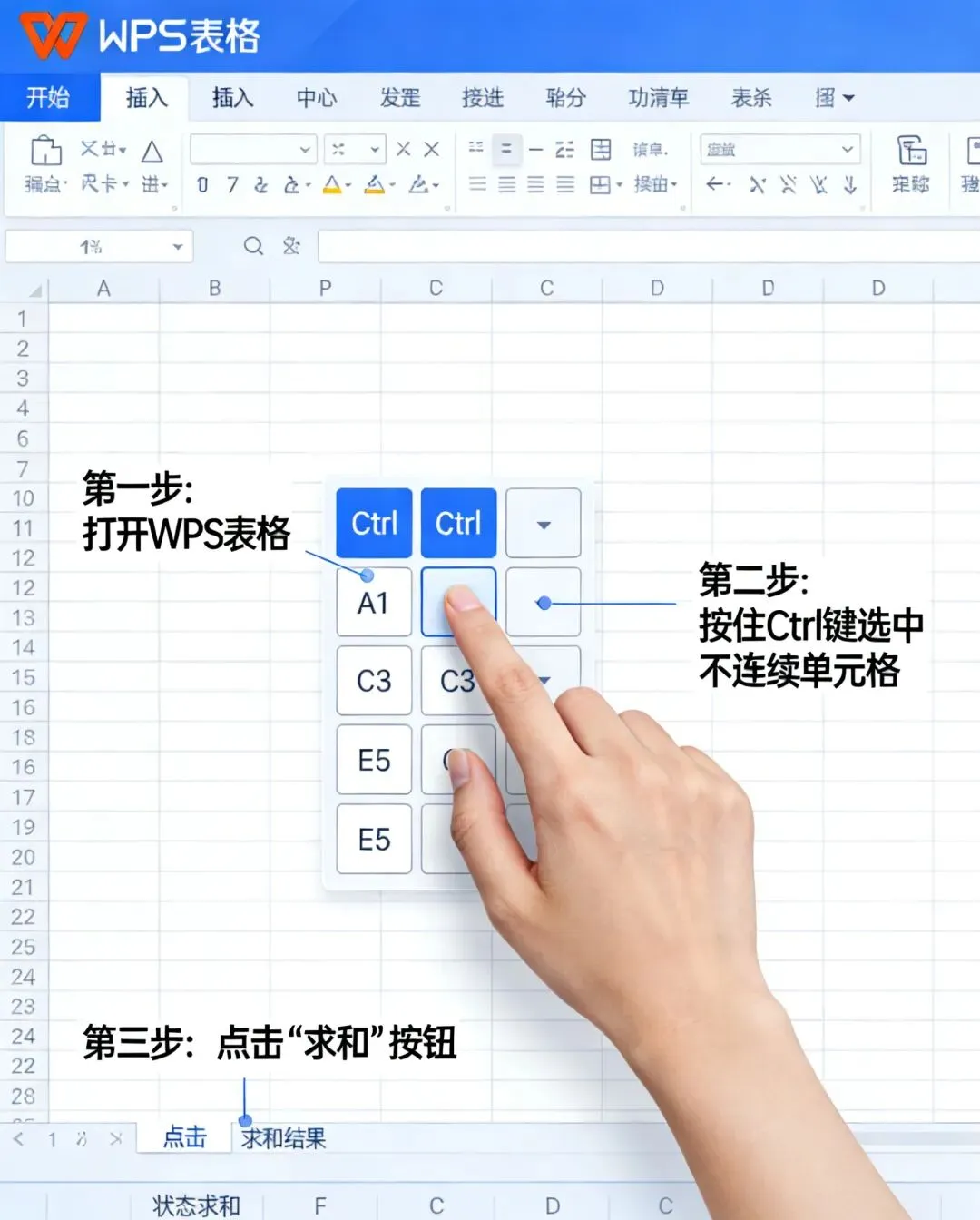 适合:不挨着的数字求和,比如只算A1、C3、E5这几个零散数字