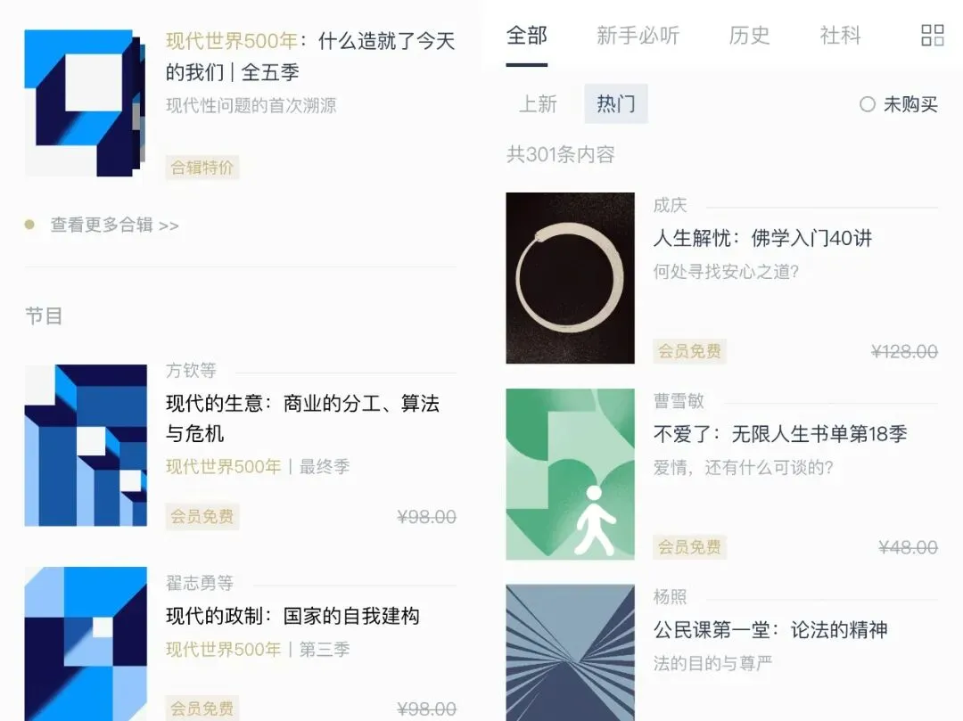 我个人特别喜欢的节目是《从中国出发的全球史1-6季》和《现代世界500年:什么造就了今天的我们?》《人生解忧:佛学入门40讲》,它们既有宏大的历史叙事,也有对现代性的深刻洞察。