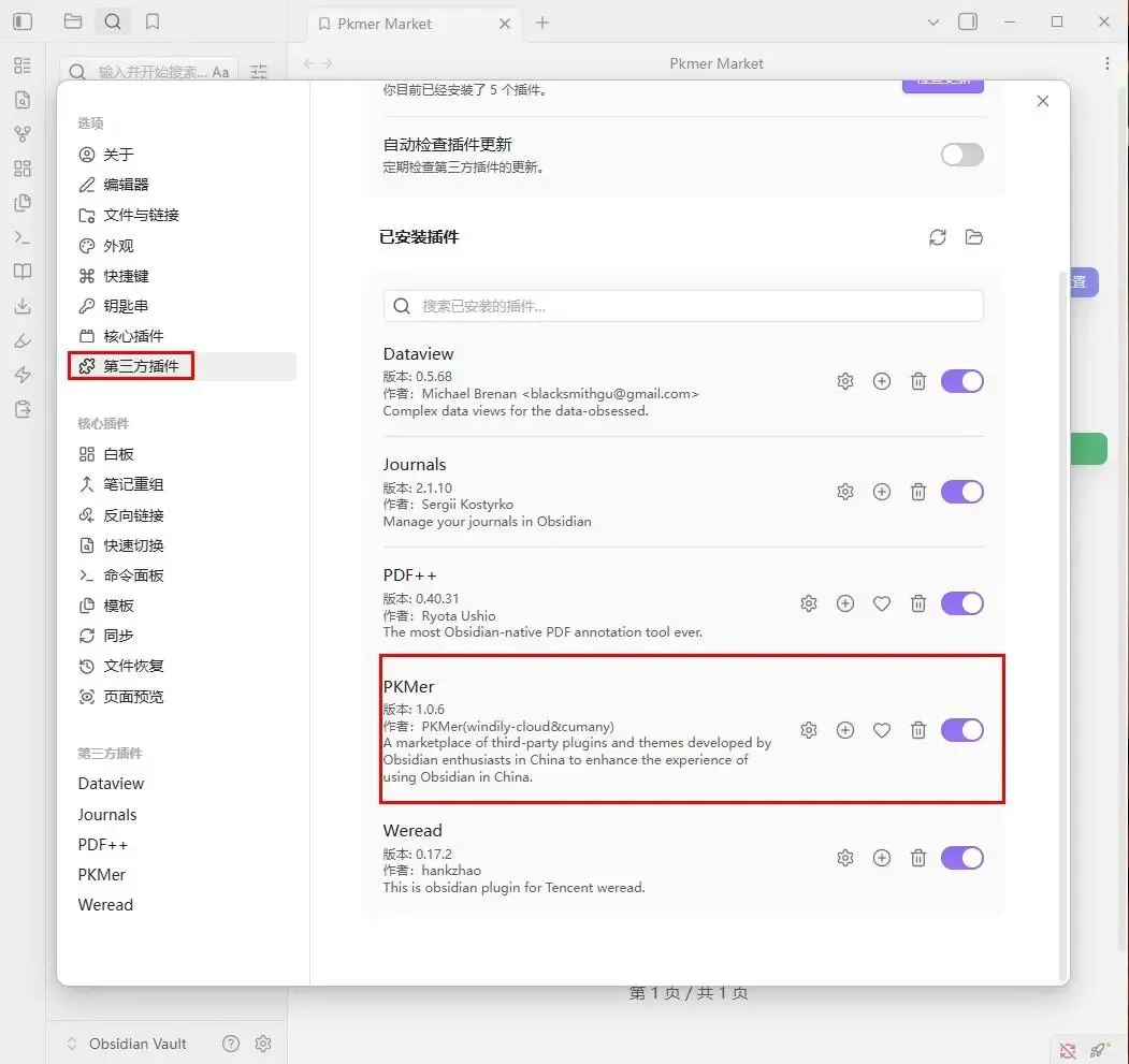 接下来,点击左下角设置 → 第三方插件 → 已安装插件→ PKMer,点击启用。