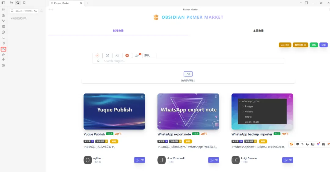 安装完成后,单击侧边栏的Open PKMer Market图标,就可以通过这个插件再下载其他插件,可以选择不使用“设置 → 第三方插件 → 社区插件市场 → 浏览”这个路径去下载了。