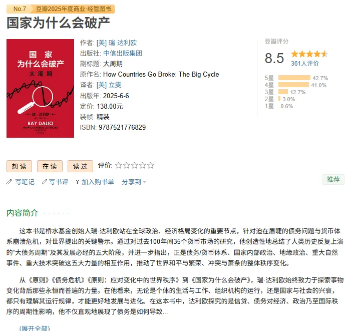 《国家为什么会破产:大周期》PDF 分享电子资料 关注我,获取更多电子书免费分享 ~ 默认提供PDF版本,如需其他版本请联系我;如需找书(每本1r)请联系我 作者: [美] 瑞·达利欧出版社: 中信出版集团副标题: 大周期原作名: How Countries Go Broke: The Big Cycle译者: [美] 立雯出版年: 2025-6-6ISBN: 9787521776829 《国家为什么会破产:大周期》是桥水基金创始人瑞・达利欧的重磅宏观力作,用大债务周期揭开国家兴衰的底层规律。 本书以千年历史为样本,拆解国家从繁荣到危机的完整周期:信贷扩张催生繁荣、债务泡沫累积、顶部失衡、去杠杆阵痛,最终走向危机或重生。达利欧指出,国家破产并非突发崩盘,而是债务增速长期超越经济增长的必然结果。 书中融合货币、财政、地缘、社会秩序等多维视角,不讲晦涩理论,用清晰逻辑帮普通人看懂宏观大势、识别周期风险。 它既是看懂全球经济的 “导航仪”,也是普通人应对周期变化、守住财富的清醒指南,帮你在变局中保持理性与定力。 “找书不易,您的打赏是我坚持的动力” 本期书单电子书下载链接,点击文章末尾左下方阅读原文自动跳转。 默认提供PDF版本,如需其他版本请联系我;有偿找书(每本1r)请联系我ruyissq6688; 免责声明 本公众号相关电子资源均收集自互联网,仅供学习使用,下载后请于24小时内自行删除,如有侵权请联系ruyissq6688删除