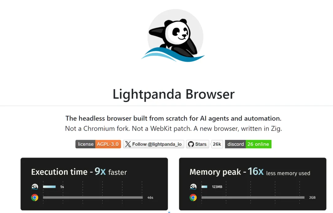 现在 Chrome 浏览器功能非常多,运行起来也很慢,有大神就用 Zig 语言从头写了一个 Lightpanda 浏览器,现在在github上星星都2万多了。而且这个浏览器是专门给 Agent用的。