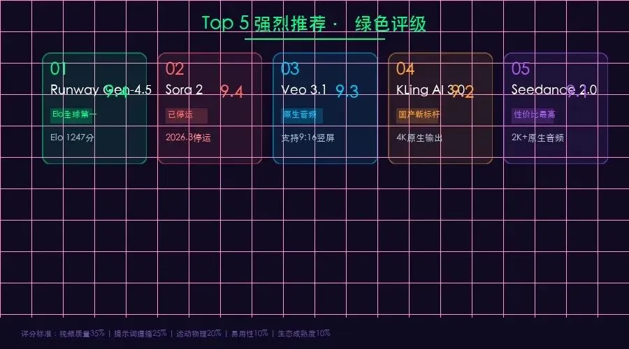 评分标准:视频质量(35%)、提示词遵循(25%)、运动物理(20%)、易用性(10%)、生态成熟度(10%)