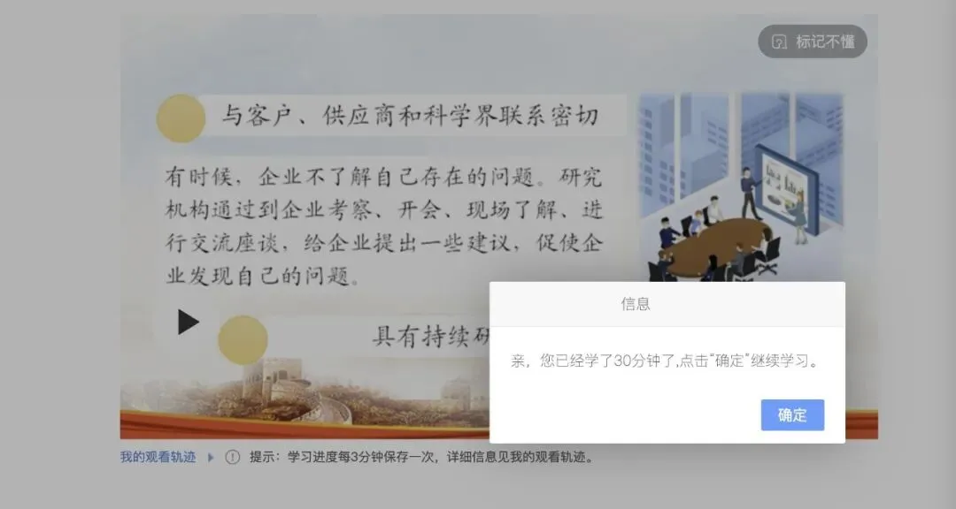 如果 30 分钟内没人看视频,它就会跳出如下信息,提示你要点击“确定”才能继续学习。