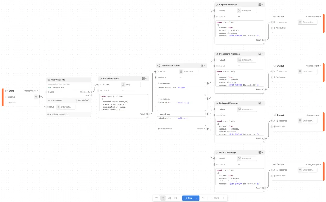 拖拽“条件判断”块:若 status 为 “shipped”,返回物流信息;若为 “pending”,返回预计时间。