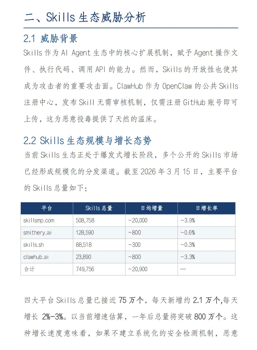 OpenClaw靠安装“技能包”扩展能力,但公共平台发布几乎零审核!四大平台技能总量已近75万个,每天新增约2.1万个。奇安信扫描了24万多个技能,发现190个明确恶意,7700多个可疑。