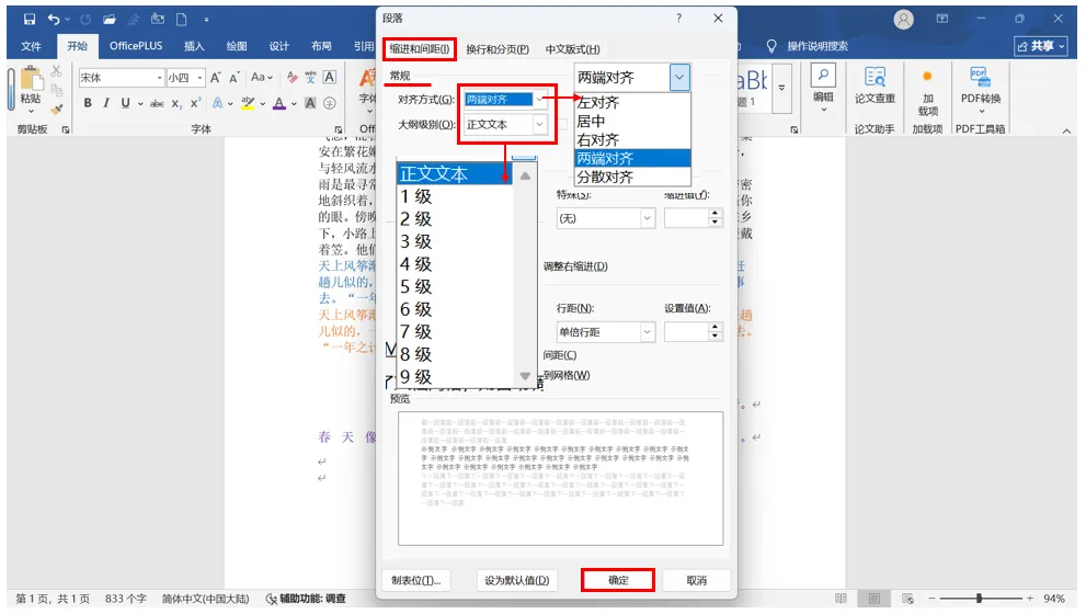 按住鼠标左键选择需要设置的段落/或“Ctrl+A”全选文档内容→点击“开始”选项卡→找到对应的“段落”功能区内的“段落设置”图标(图1)→鼠标左键单击,随后弹出“段落”设置弹窗(图3)→选择“缩进和间距”项→在“常规”栏中,“对齐方式”根据需要选择,“大纲级别”选择“正文文本”,其余“1级、2级”等,表示的是标题级别,注意目前我们设置的段落是针对正文文本的设置→设置结束后点击右下角“确定”即完成段落对齐设定。