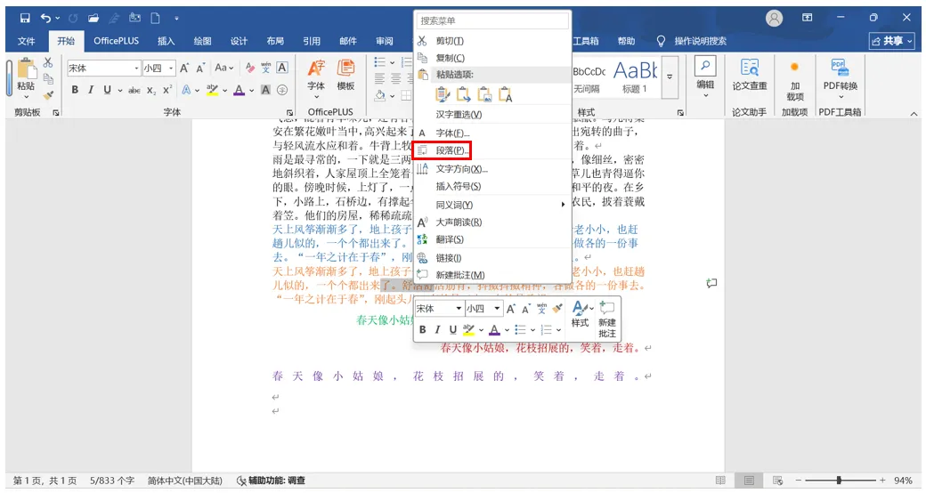 按住鼠标左键选择需要设置的段落/或“Ctrl+A”全选文档内容→鼠标右键单击→在弹窗中选择“段落”属性(图4)→打开“段落”设置弹窗,之后的设置与方法②一样。