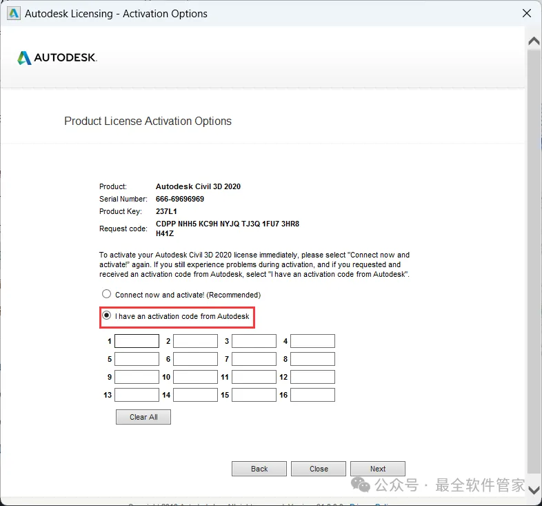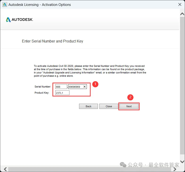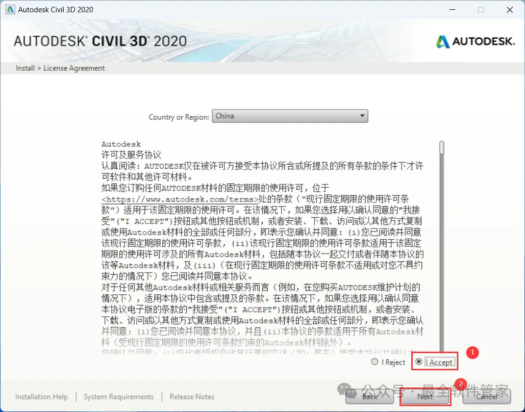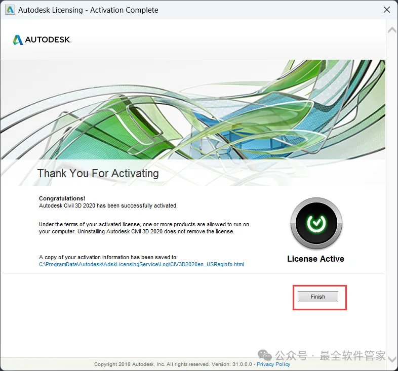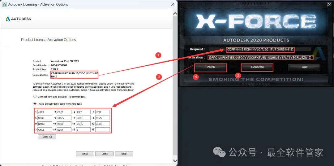 安装需知[软件名称]:Civil 3D 2020[软件大小]:3.33G[软件语言]:中文简体[安装环境]:Win7及以上版本[下载地址]:公众号内回复:Civil3D[不限速下载]:免费获取百度网盘不限速下载工具。公众号内回复:不限速[注意事项]:安装前请关闭网络、杀毒软件和防火墙,否则易安装失败。公众号内回复:1[解压软件]:小编用的解压软件是Bandizip,获取Bandizip软件安装包。公众号内回复:2安装教程1、下载Civil 3D 2020软件安装包到电脑上,右键选择【解压到Civil 3D 2020\】2、右键【打开】解压后的文件夹 3、找到【Autodesk_Civil3D_2020】应用程序,右键选择【以管理员身份运行】它4、点击【确定】 5、点击【Install】6、勾选【我接受】,再点击【Next】 7、软件默认安装在C盘,可自定义更改软件安装位置,这里小编选择安装在D盘;点击【Install】 8、软件安装中,稍等片刻9、软件安装成功,点击右上角【关闭按钮】10、回到桌面,右键桌面上的【Civil 3D 2020软件图标】,点击【打开】 11、软件正在打开,启动界面如下:12、点击【enter a serial number】 13、点击【Activate】14、Serial Number输入:666-69696969,Product Key输入:237L1,再点击【Next】 15、点击右上角【关闭按钮】 16、点击【Activate】 17、Serial Number输入:666-69696969,Product Key输入:237L1,再点击【Next】 18、点击【I have an…】 19、回到Civil 3D 2020文件夹,找到【Crack】文件夹,右键【打开】它 20、找到【xf-adesk20】程序,右键选择【以管理员身份运行】它21、打开软件界面,将软件的【Request code】填入到程序的【Requset】内,再点击【Generate】,将程序的【Activation】填入到软件的【I have an…】内,再点击【Patch】 22、点击【确定】,再点击【Next】23、点击【Finish】 24、软件打开成功,运行界面如下:25、以上就是Civil 3D 2020软件安装的全过程,要是对你有帮助的话,请为小编点个赞! 免责声明:软件资源均来源于网络,仅供用户交流学习与研究使用,版权归属原版权方所有,版权争议与本公众号无关,用户本人下载后不能用作商业或非法用途,否则后果均由用户承担责任;如果您访问和下载此文件,表示您同意只将此软件用于参考、学习而非其他用途,否则一切后果请您自行承担,请于下载后24小时内删除,不允许用于商业用途,否则法律问题自行承担。如果您喜欢该软件,请支持正版软件,购买注册,得到更好的正版服务。
