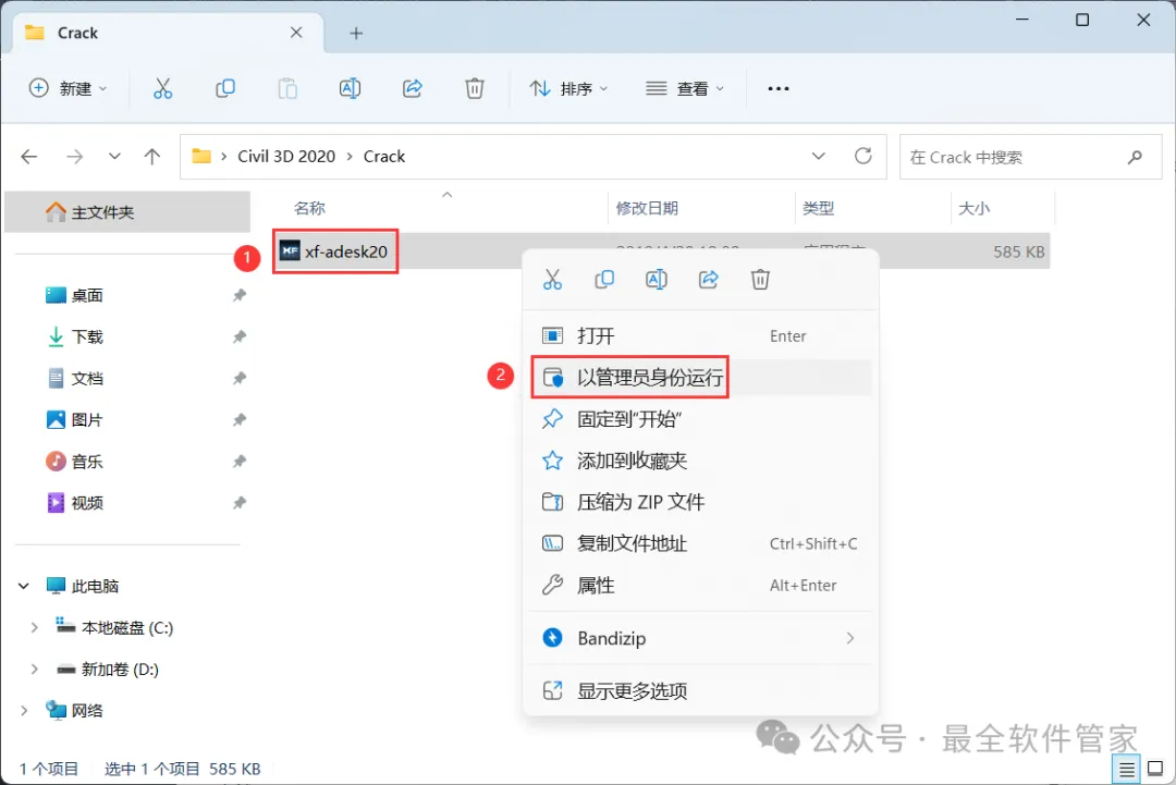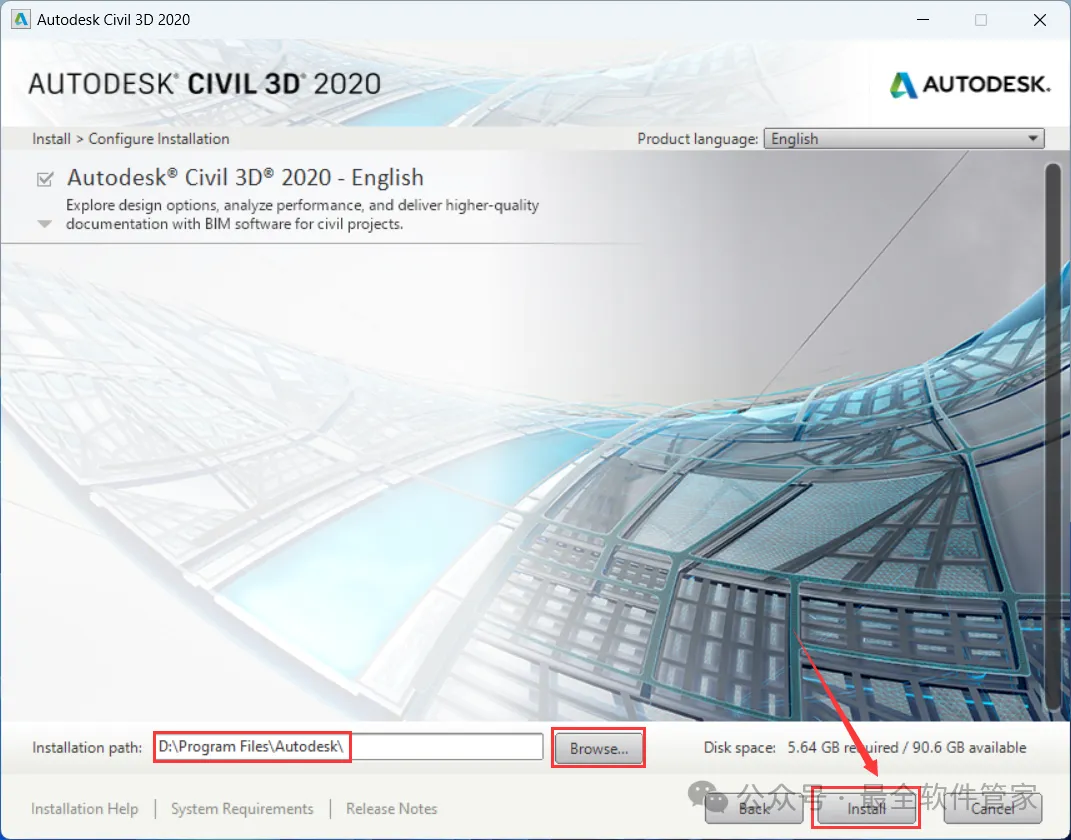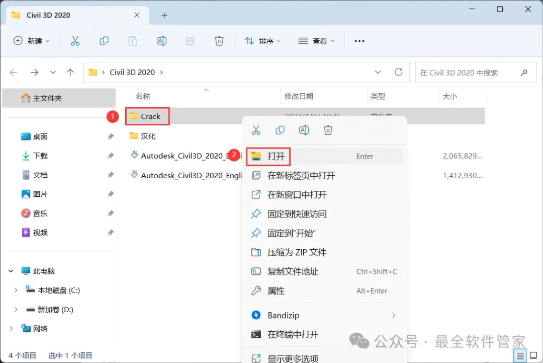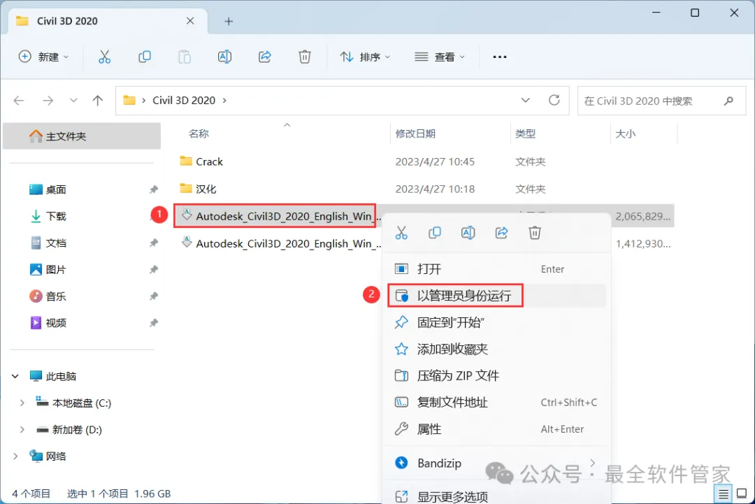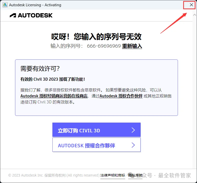 安装需知[软件名称]:Civil 3D 2020[软件大小]:3.33G[软件语言]:中文简体[安装环境]:Win7及以上版本[下载地址]:公众号内回复:Civil3D[不限速下载]:免费获取百度网盘不限速下载工具。公众号内回复:不限速[注意事项]:安装前请关闭网络、杀毒软件和防火墙,否则易安装失败。公众号内回复:1[解压软件]:小编用的解压软件是Bandizip,获取Bandizip软件安装包。公众号内回复:2安装教程1、下载Civil 3D 2020软件安装包到电脑上,右键选择【解压到Civil 3D 2020\】2、右键【打开】解压后的文件夹 3、找到【Autodesk_Civil3D_2020】应用程序,右键选择【以管理员身份运行】它4、点击【确定】 5、点击【Install】6、勾选【我接受】,再点击【Next】 7、软件默认安装在C盘,可自定义更改软件安装位置,这里小编选择安装在D盘;点击【Install】 8、软件安装中,稍等片刻9、软件安装成功,点击右上角【关闭按钮】10、回到桌面,右键桌面上的【Civil 3D 2020软件图标】,点击【打开】 11、软件正在打开,启动界面如下:12、点击【enter a serial number】 13、点击【Activate】14、Serial Number输入:666-69696969,Product Key输入:237L1,再点击【Next】 15、点击右上角【关闭按钮】 16、点击【Activate】 17、Serial Number输入:666-69696969,Product Key输入:237L1,再点击【Next】 18、点击【I have an…】 19、回到Civil 3D 2020文件夹,找到【Crack】文件夹,右键【打开】它 20、找到【xf-adesk20】程序,右键选择【以管理员身份运行】它21、打开软件界面,将软件的【Request code】填入到程序的【Requset】内,再点击【Generate】,将程序的【Activation】填入到软件的【I have an…】内,再点击【Patch】 22、点击【确定】,再点击【Next】23、点击【Finish】 24、软件打开成功,运行界面如下:25、以上就是Civil 3D 2020软件安装的全过程,要是对你有帮助的话,请为小编点个赞! 免责声明:软件资源均来源于网络,仅供用户交流学习与研究使用,版权归属原版权方所有,版权争议与本公众号无关,用户本人下载后不能用作商业或非法用途,否则后果均由用户承担责任;如果您访问和下载此文件,表示您同意只将此软件用于参考、学习而非其他用途,否则一切后果请您自行承担,请于下载后24小时内删除,不允许用于商业用途,否则法律问题自行承担。如果您喜欢该软件,请支持正版软件,购买注册,得到更好的正版服务。