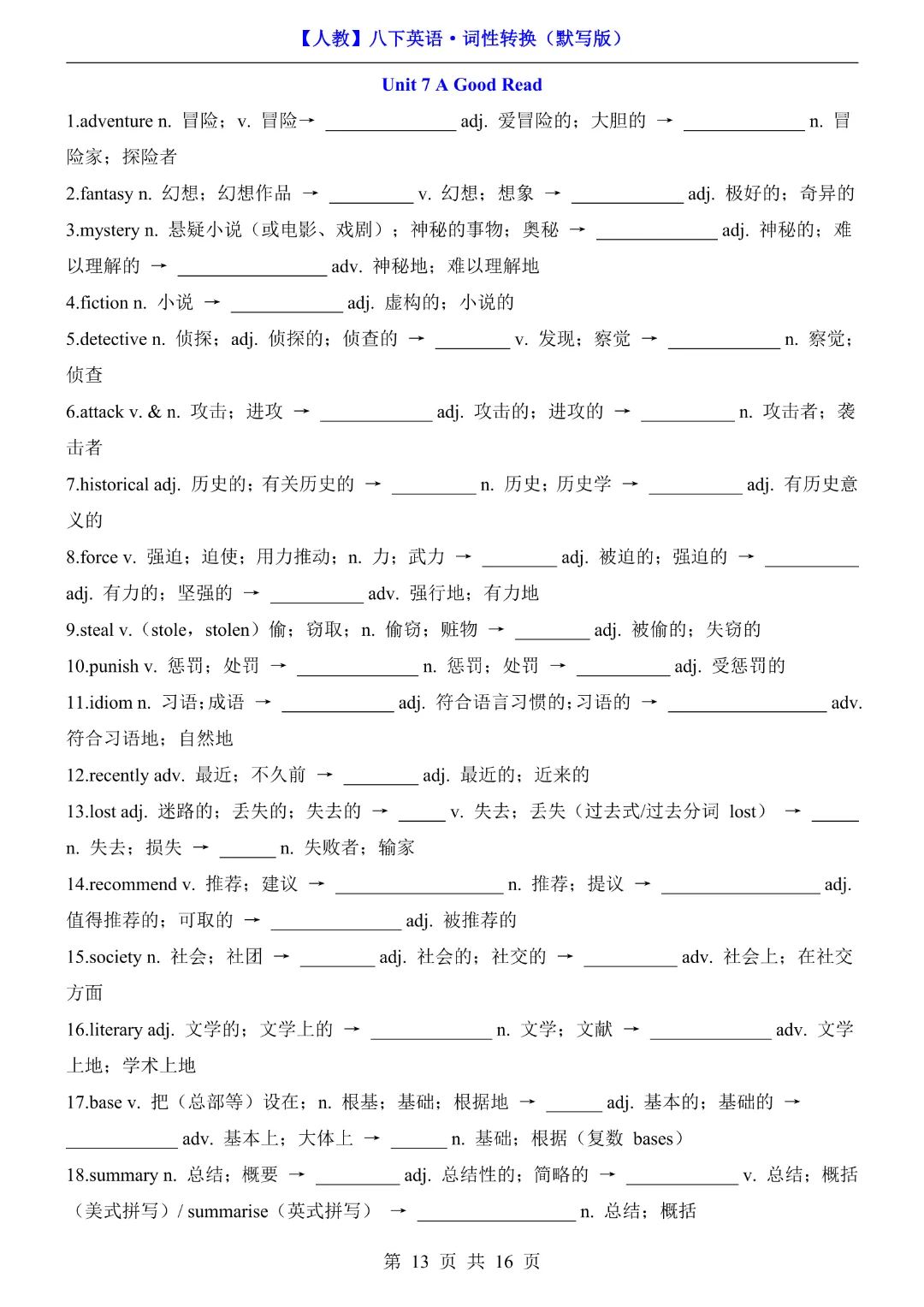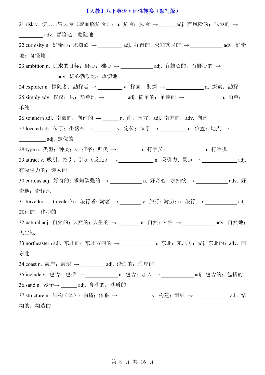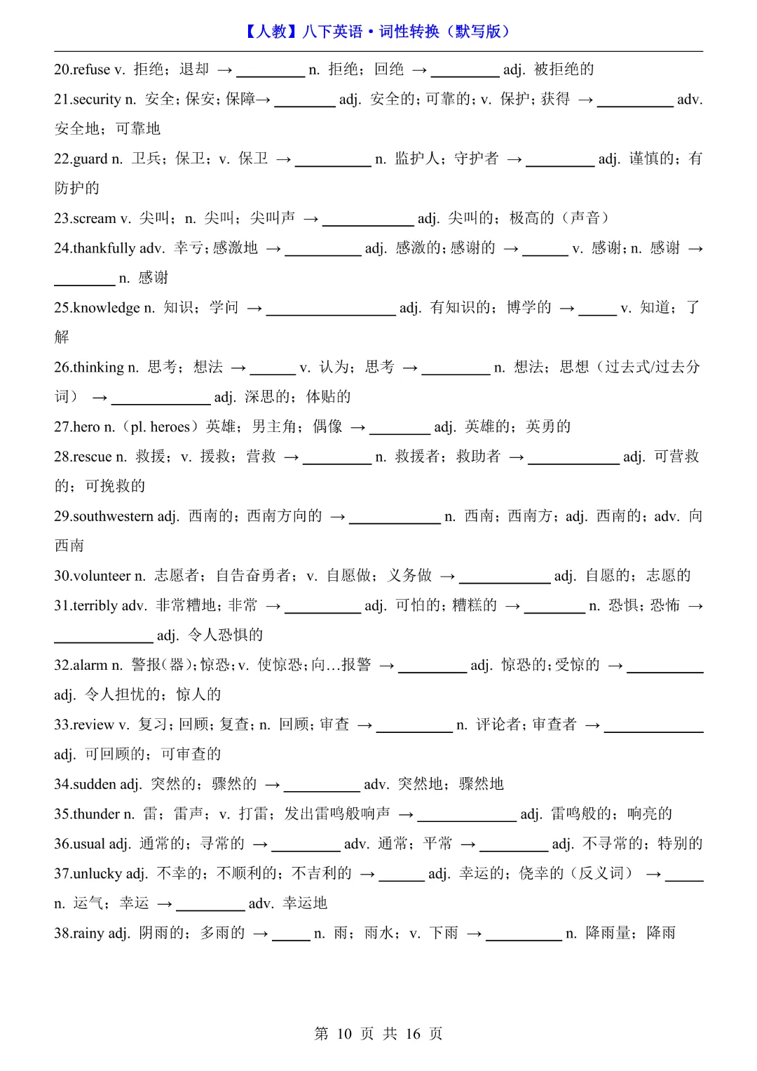 🌟今天给家长们分享的是:八年级下册英语【人教版】《词性转换默写版》完整高清电子版可打印