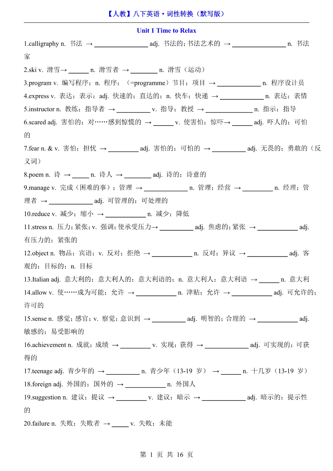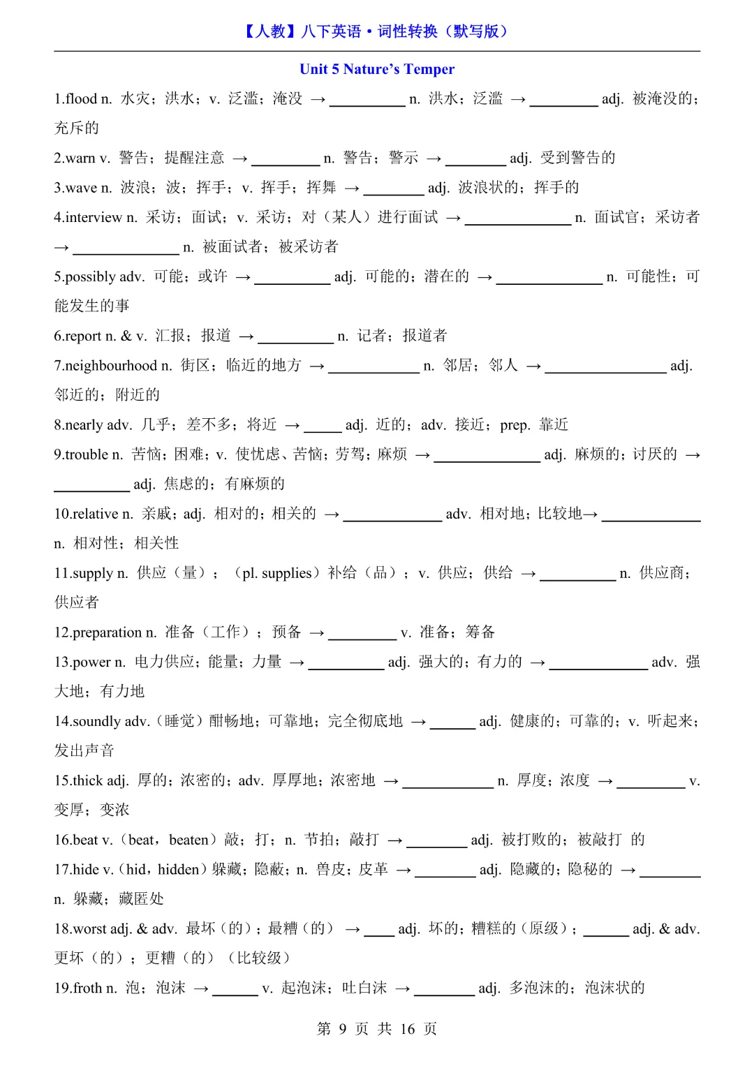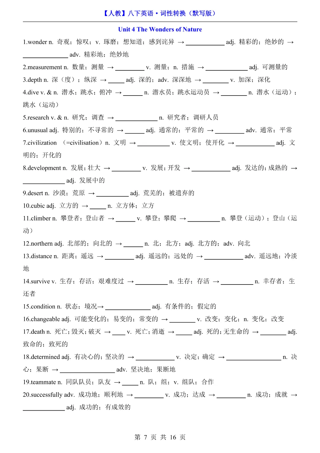 🌟今天给家长们分享的是:八年级下册英语【人教版】《词性转换默写版》完整高清电子版可打印