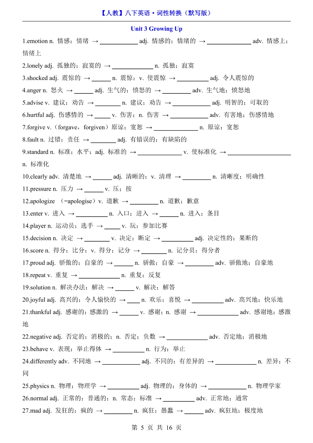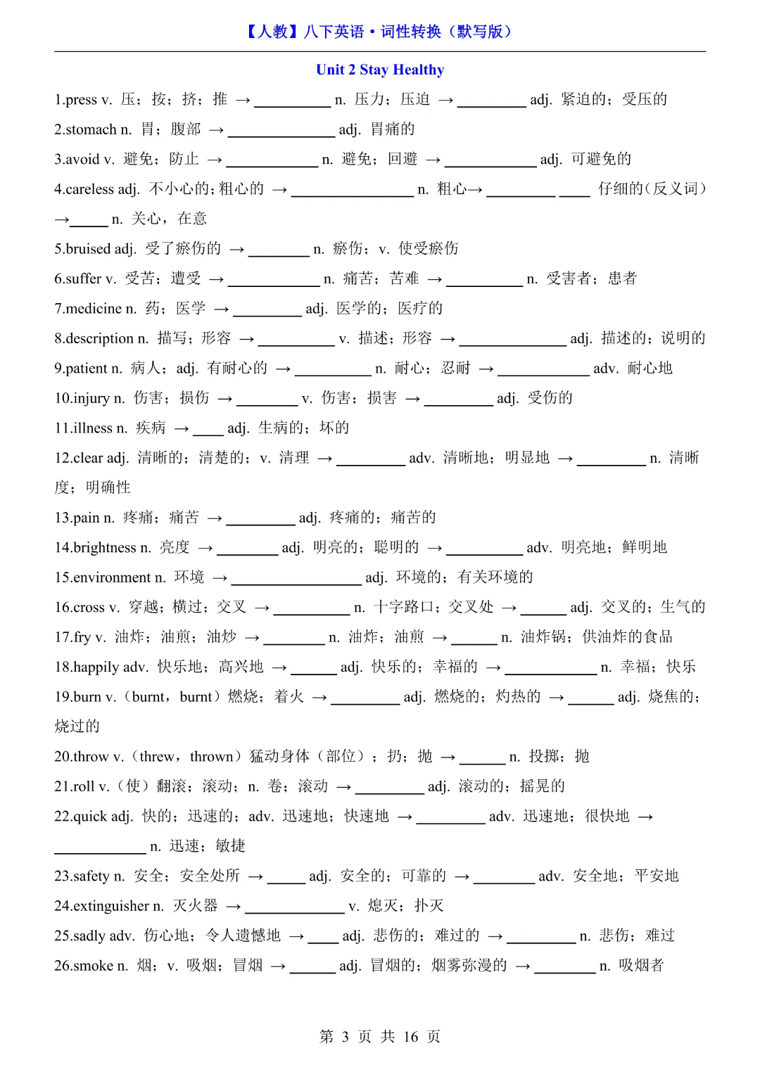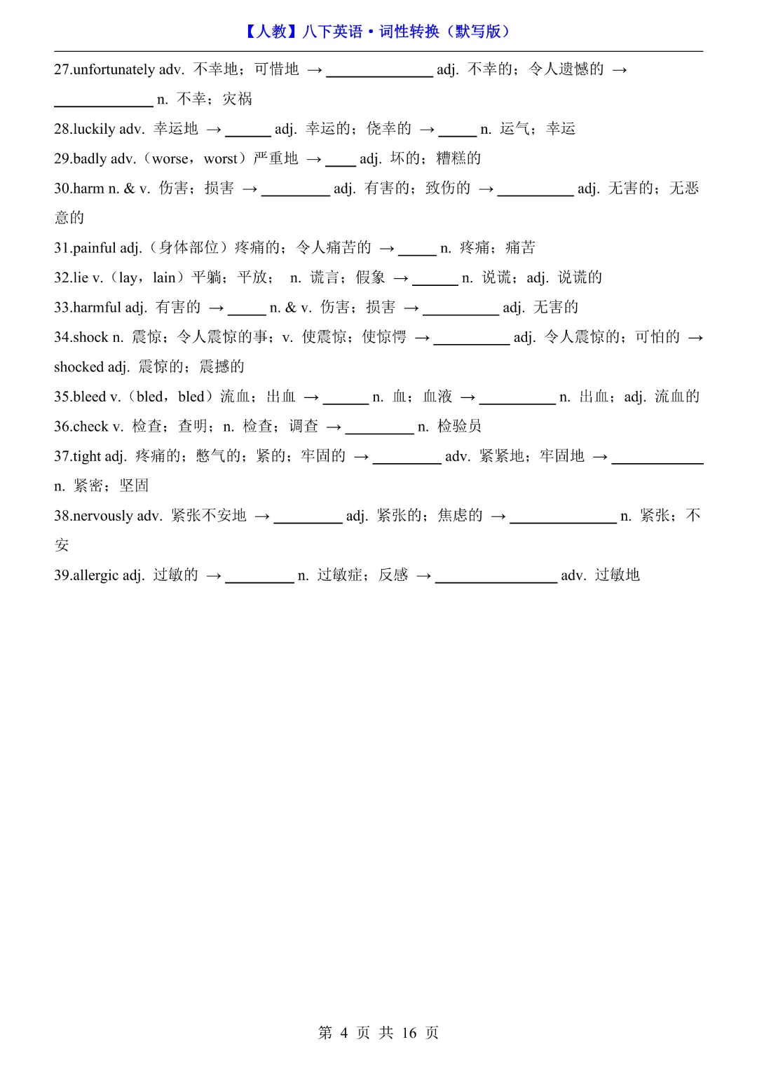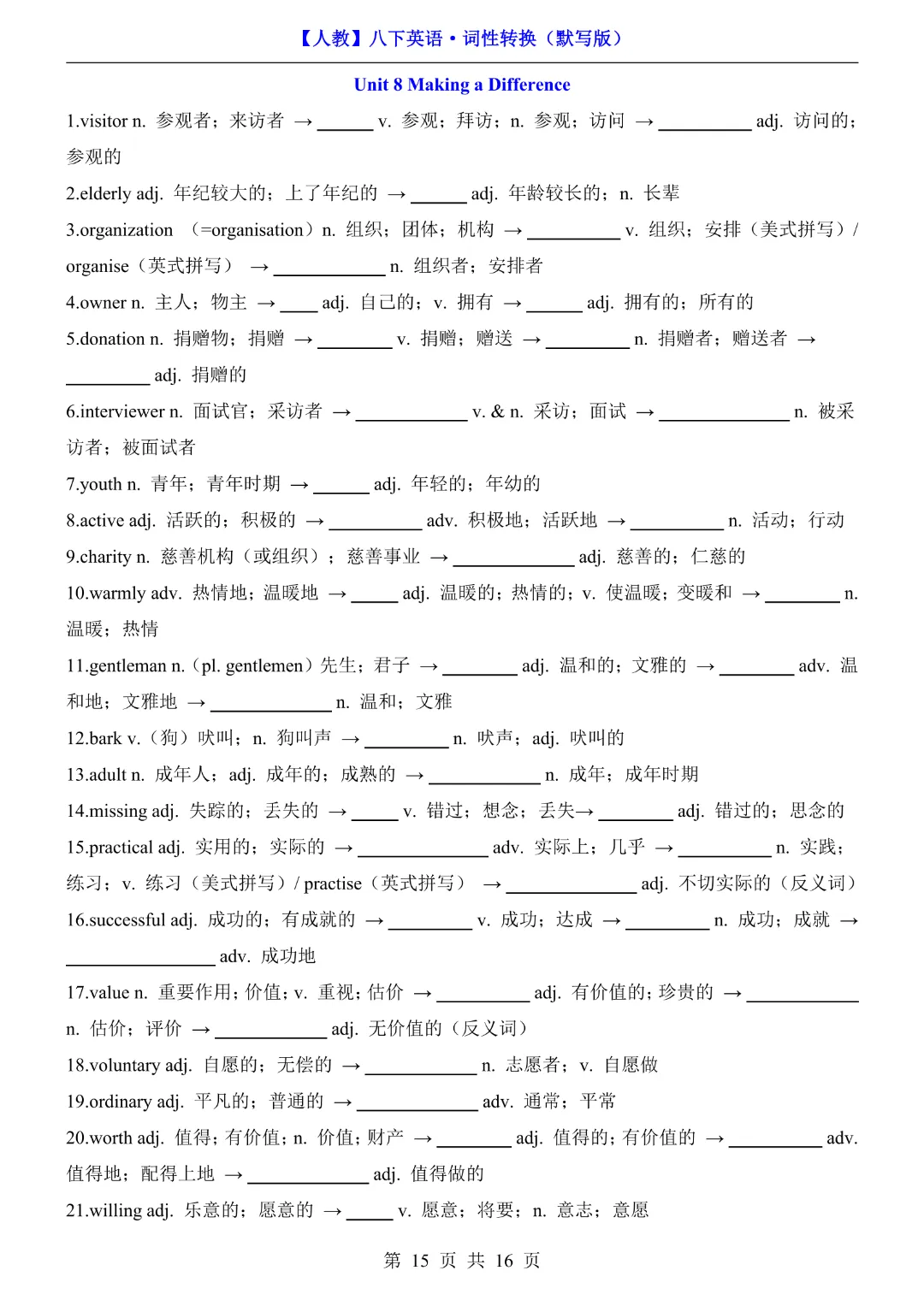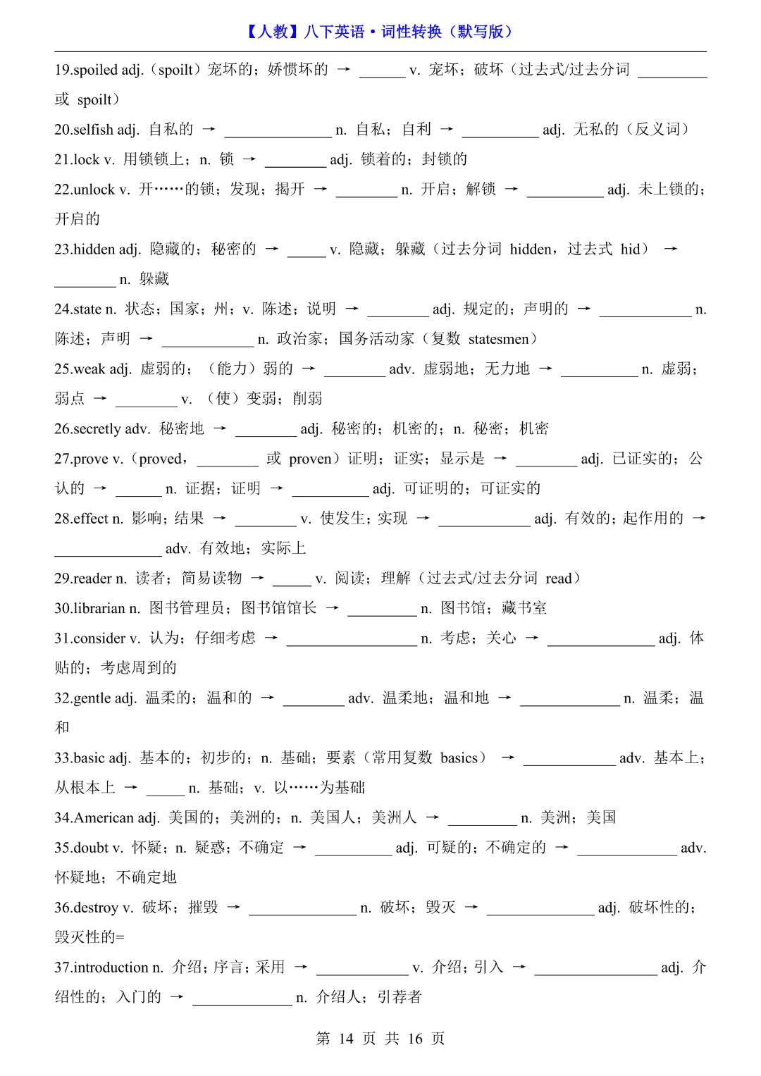 八年级下册英语【人教版】《词性转换默写版》完整高清电子版可打印